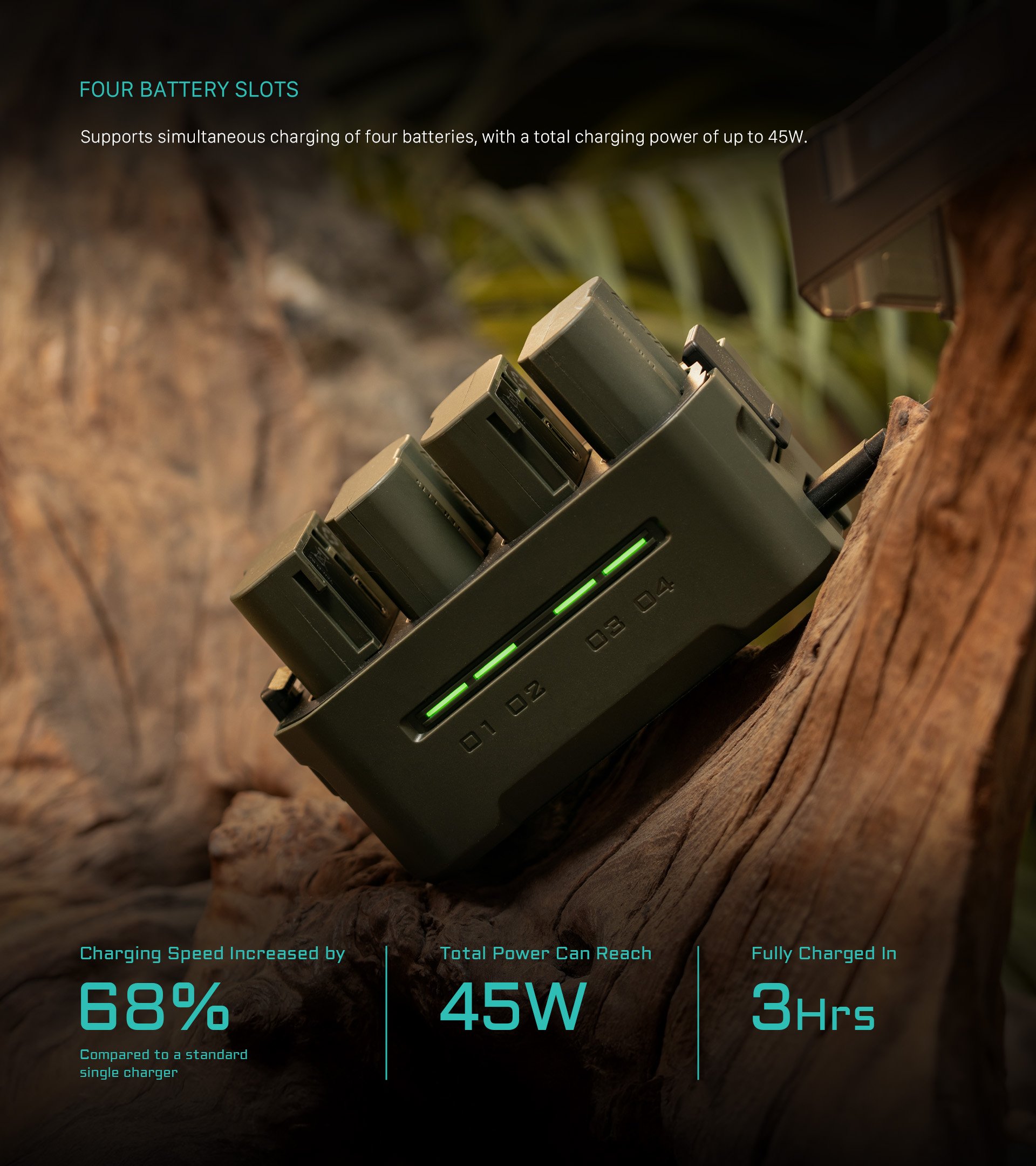 Está equipada con carga rápida PD de 45 W y ofrece una velocidad de carga un 68 % superior a la de un cargador estándar simple, por lo que tus baterías estarán listas para la acción en tan solo 3 horas.