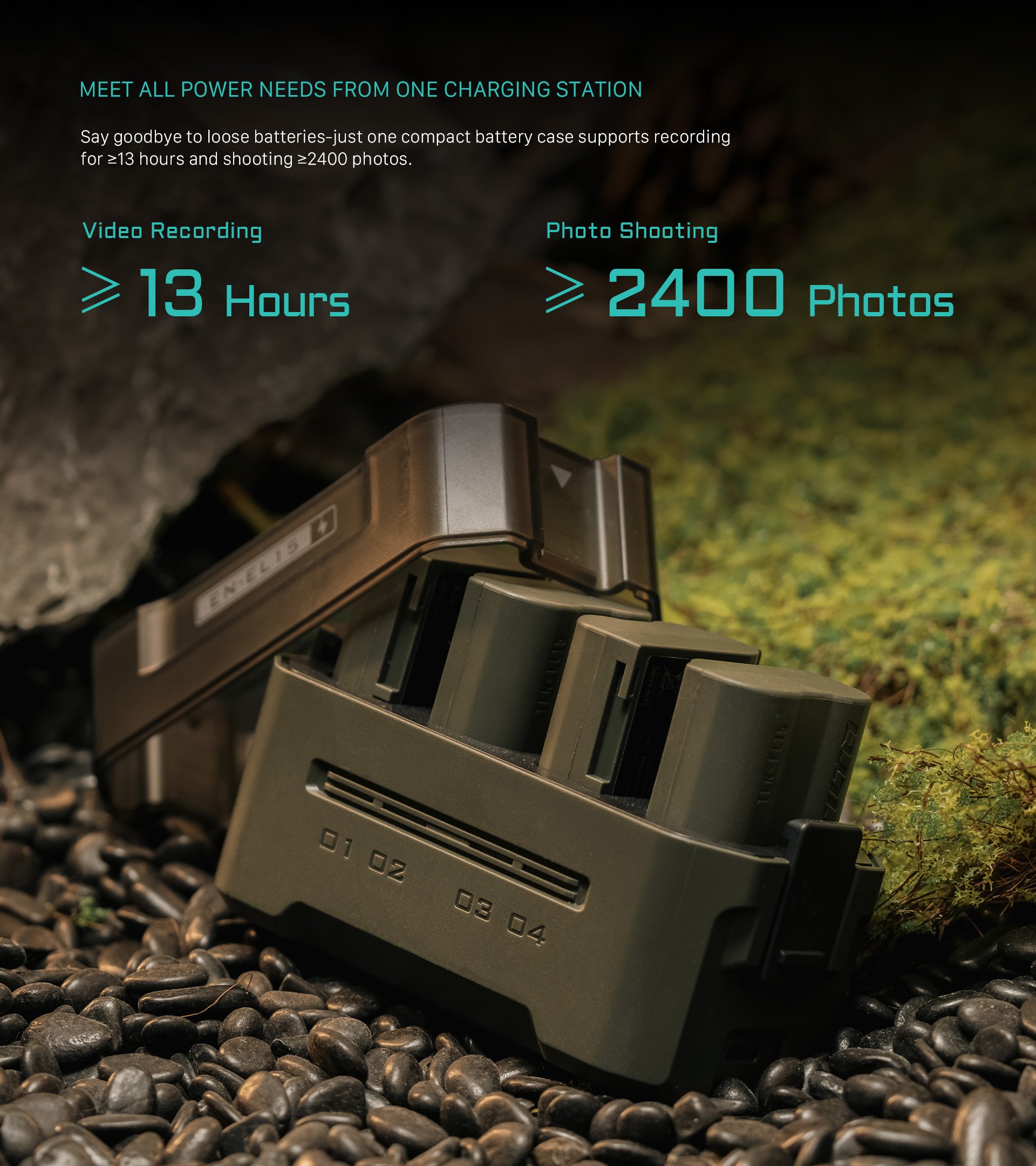 Gracias a su capacidad para cargar completamente cuatro baterías EN-EL15C, los usuarios estarán preparados para hasta 13 horas de grabación de vídeo o tendrán energía suficiente para procesar 2400 fotografías, lo que resulta ideal para sesiones fotográficas prolongadas.
