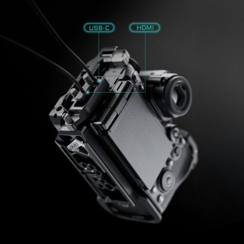 La abrazadera incluida para cables HDMI y USB-C garantiza que ambos cables permanezcan seguros una vez conectados al cuerpo de la cámara.