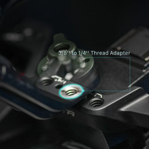 Esta jaula para cámara está equipada con fijaciones para correa de muñeca, rosca de 1/4″-20 con puntos de referencia y un adaptador de rosca de 3/8″-16 a 1/4″-20.
