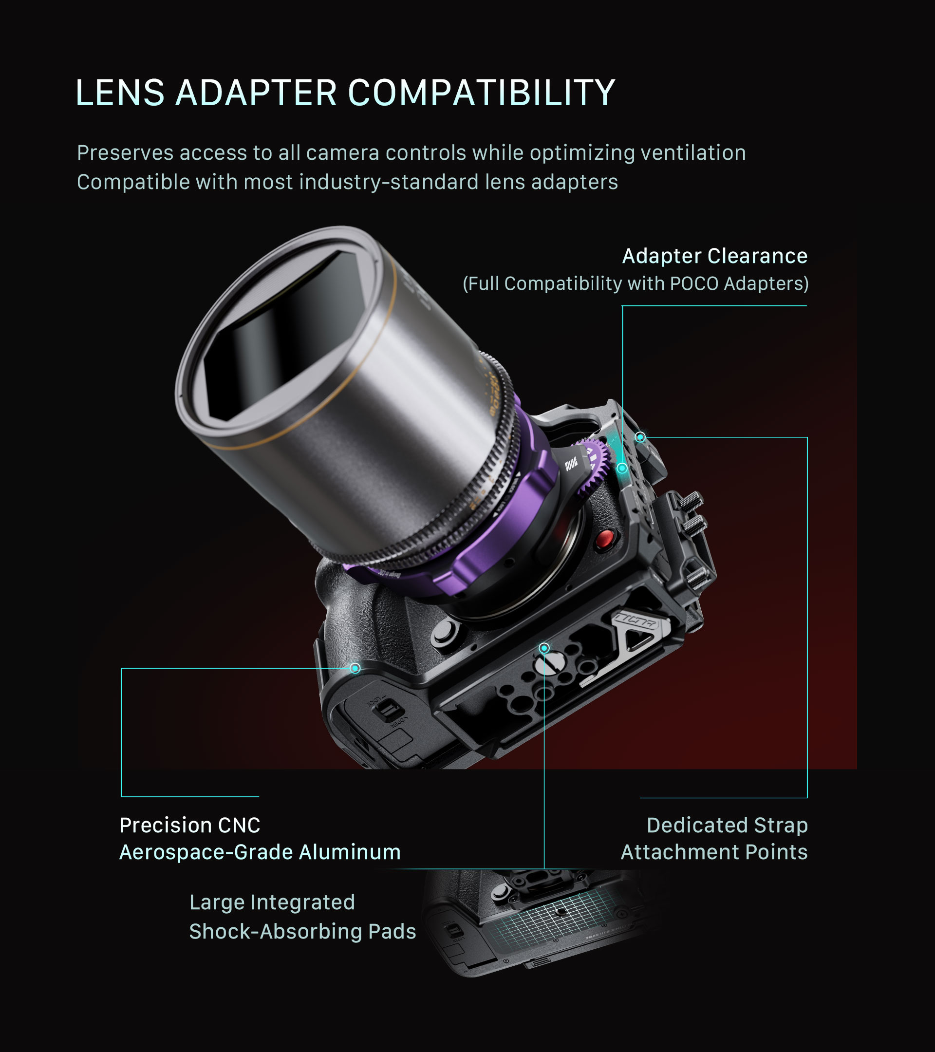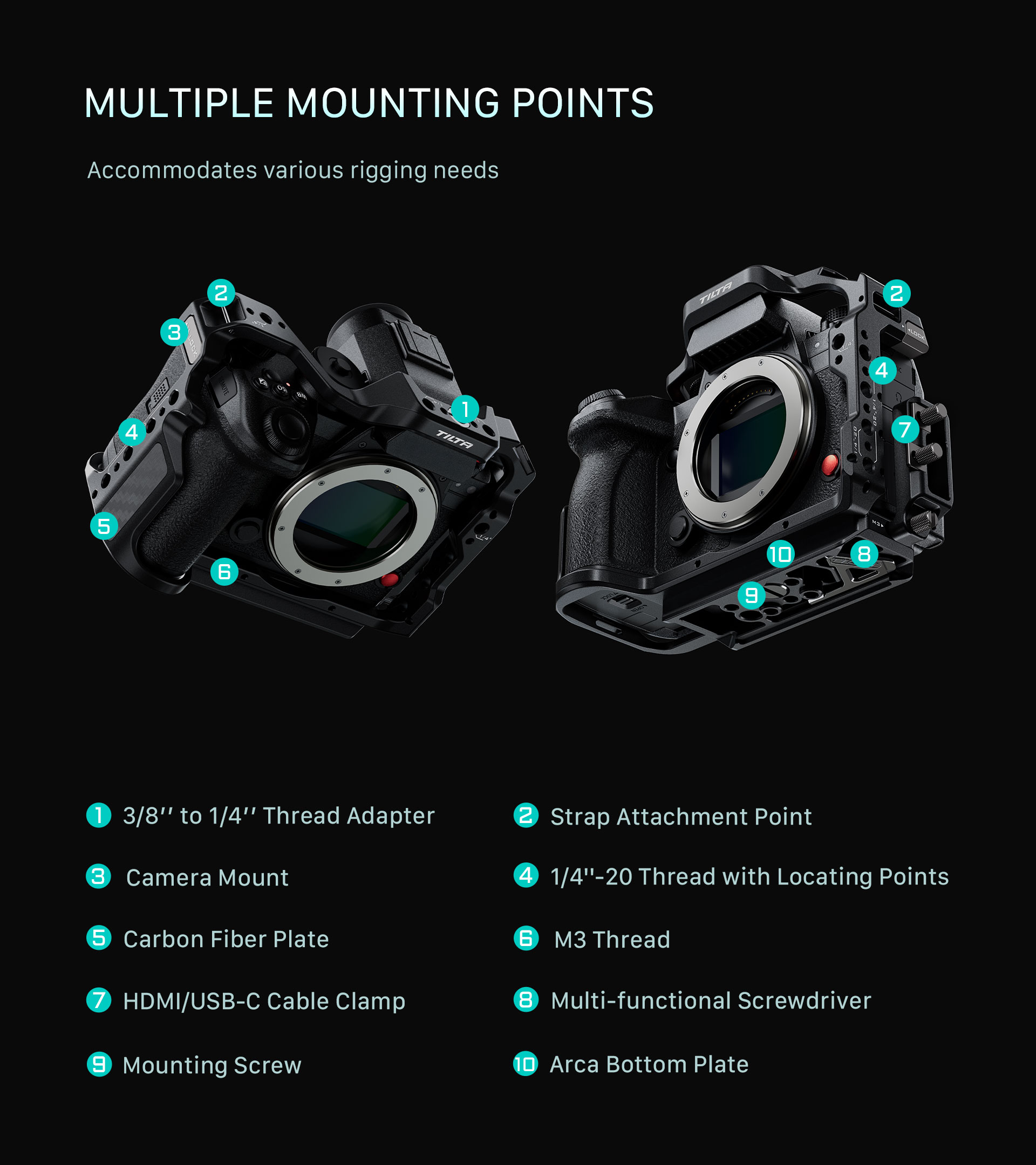Presentamos una jaula para la cámara Panasonic S1R II. Esta jaula completa para cámara ofrece protección y amplía las opciones de fijación de las cámaras S1R II, Lumix S5 II, S5 IIX y G9 II. Esta jaula para cámara está equipada con fijaciones para correa de muñeca, rosca de 1/4″-20 con puntos de referencia y un adaptador de rosca de 3/8″-16 a 1/4″-20.