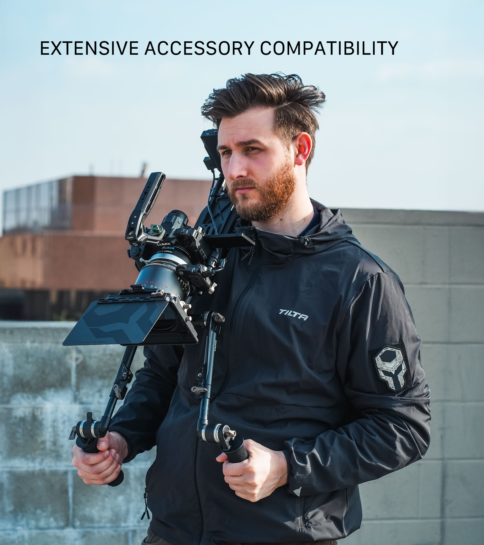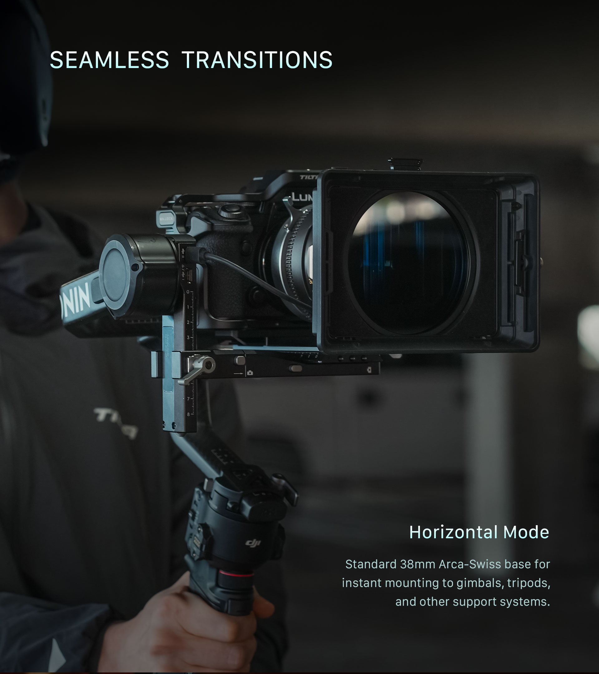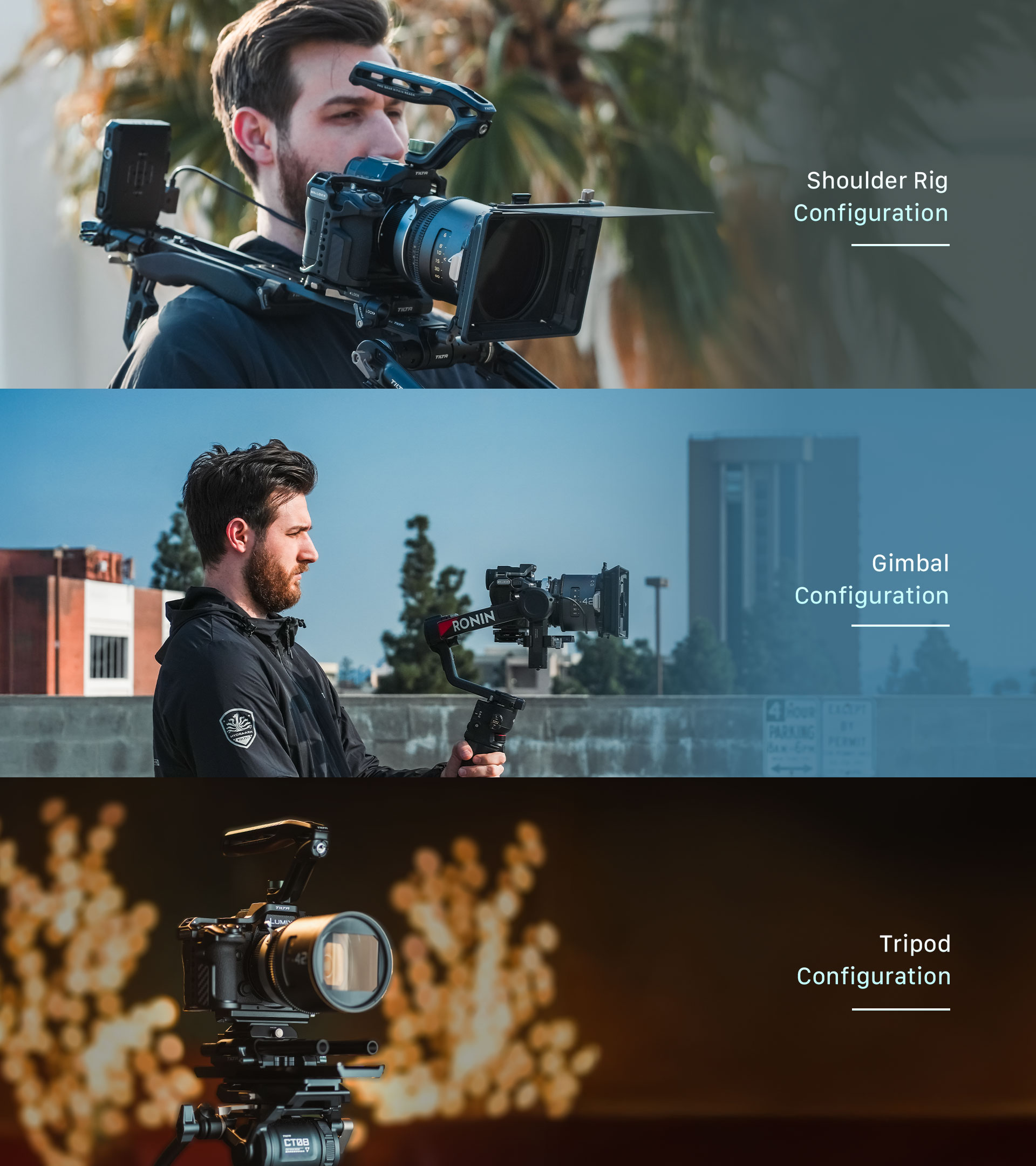 Incluye una placa inferior ARCA que permite a los usuarios montar fácilmente el sistema en diversos trípodes, sistemas de soporte y soportes cardán DJI Ronin, como el RS4 Pro.