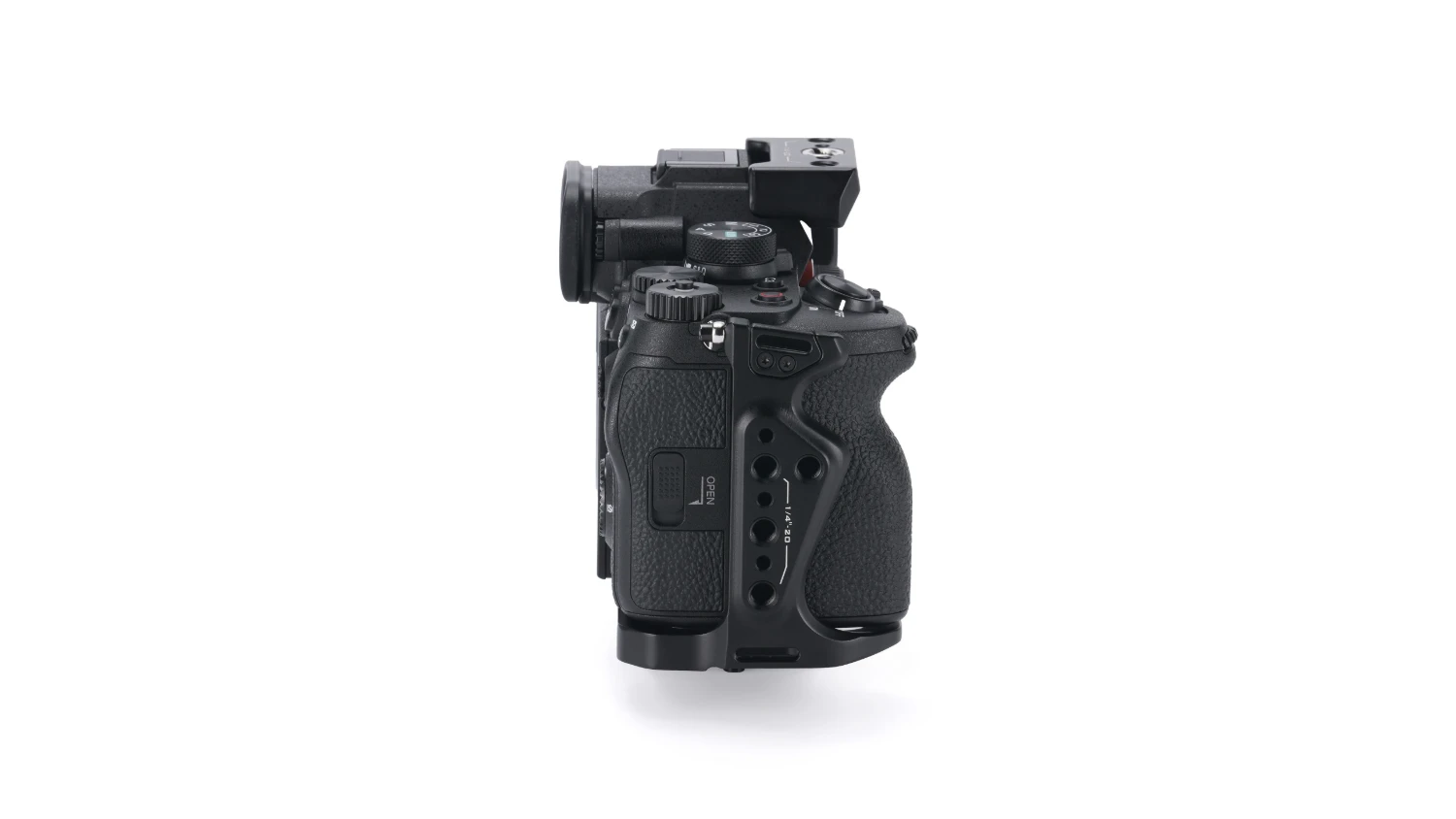 La jaula facilita la captura vertical, ya que permite fijar empuñaduras mediante roscas integradas de 1/4”-20. Esto permite sujetar la cámara de forma estable con ambas manos, lo que mejora notablemente el control al fotografiar o grabar en vertical.