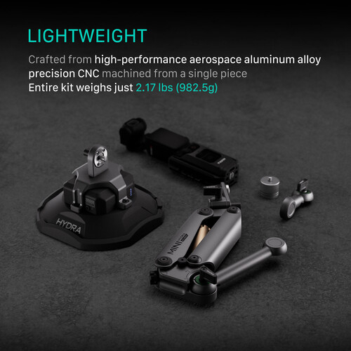 El kit está fabricado en aleación de aluminio aeronáutico y mecanizado con precisión mediante CNC, y pesa tan solo 2,6 kg. Su sistema de amortiguación hidráulica utiliza aceite amortiguador de calidad automovilística, lo que garantiza una estabilización de nivel profesional al reducir las microvibraciones. La ventosa electrónica incluida supervisa activamente la presión y ajusta automáticamente la succión, con una autonomía de hasta 14 horas gracias a su batería de 2000 mAh.