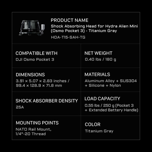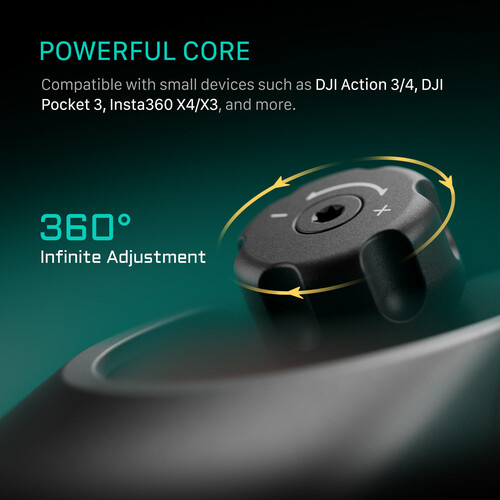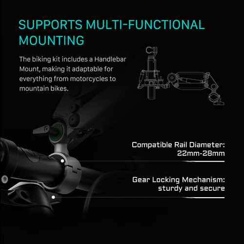 La plataforma de estabilización multieje Hydra™ aísla además las vibraciones de alta frecuencia y garantiza grabaciones fluidas incluso en terrenos irregulares. El cabezal de amortiguación está optimizado para la DJI Osmo Pocket 3, mientras que el soporte para manillar es compatible con diámetros de 22,2 mm y 28,8 mm, por lo que se adapta a diferentes tipos de vehículos.