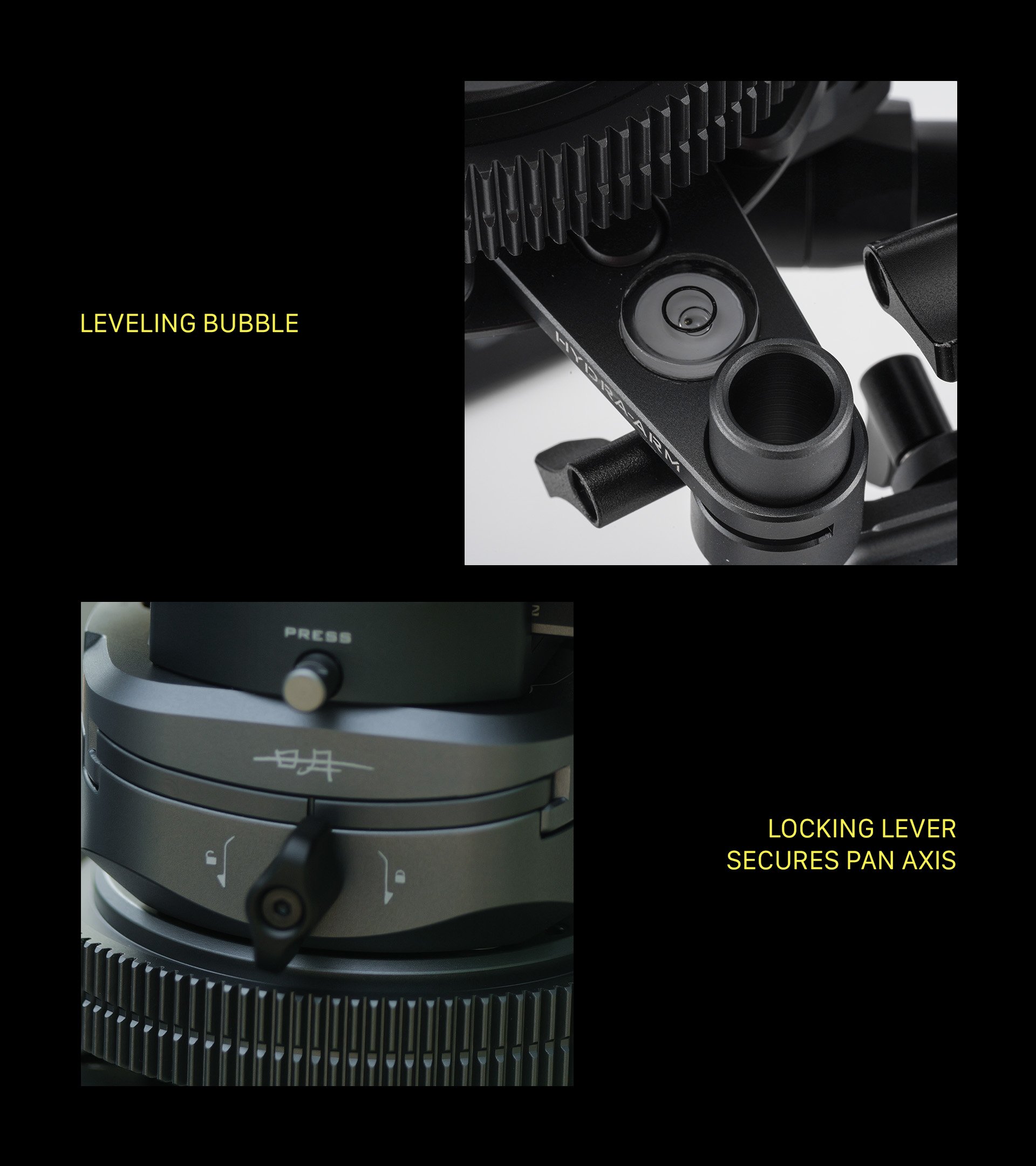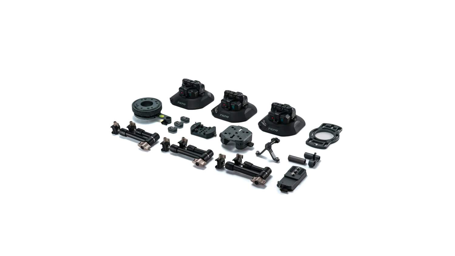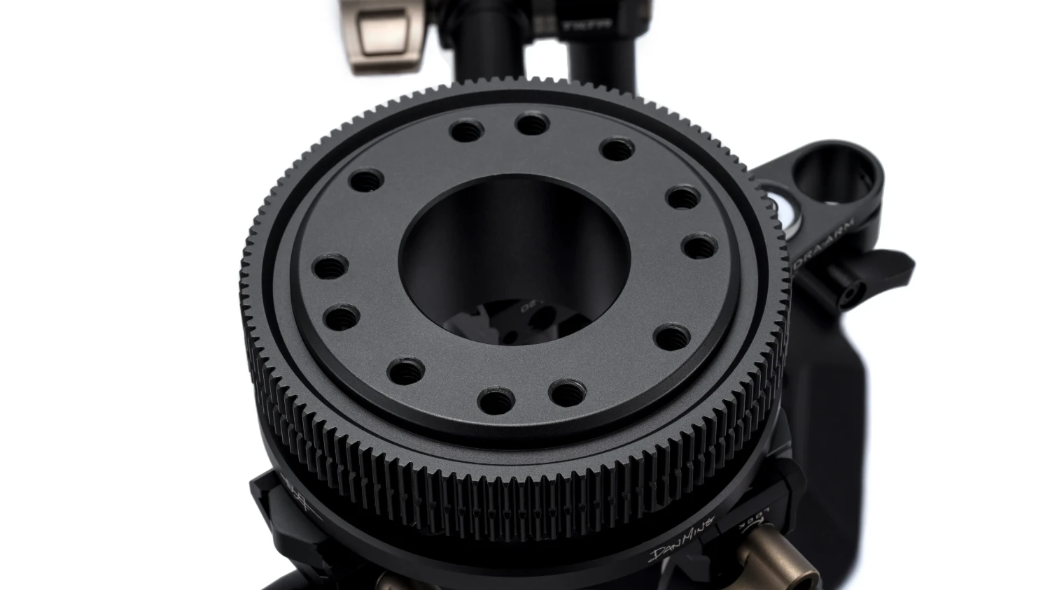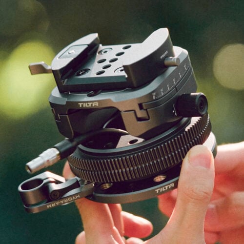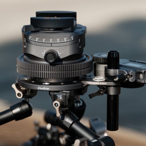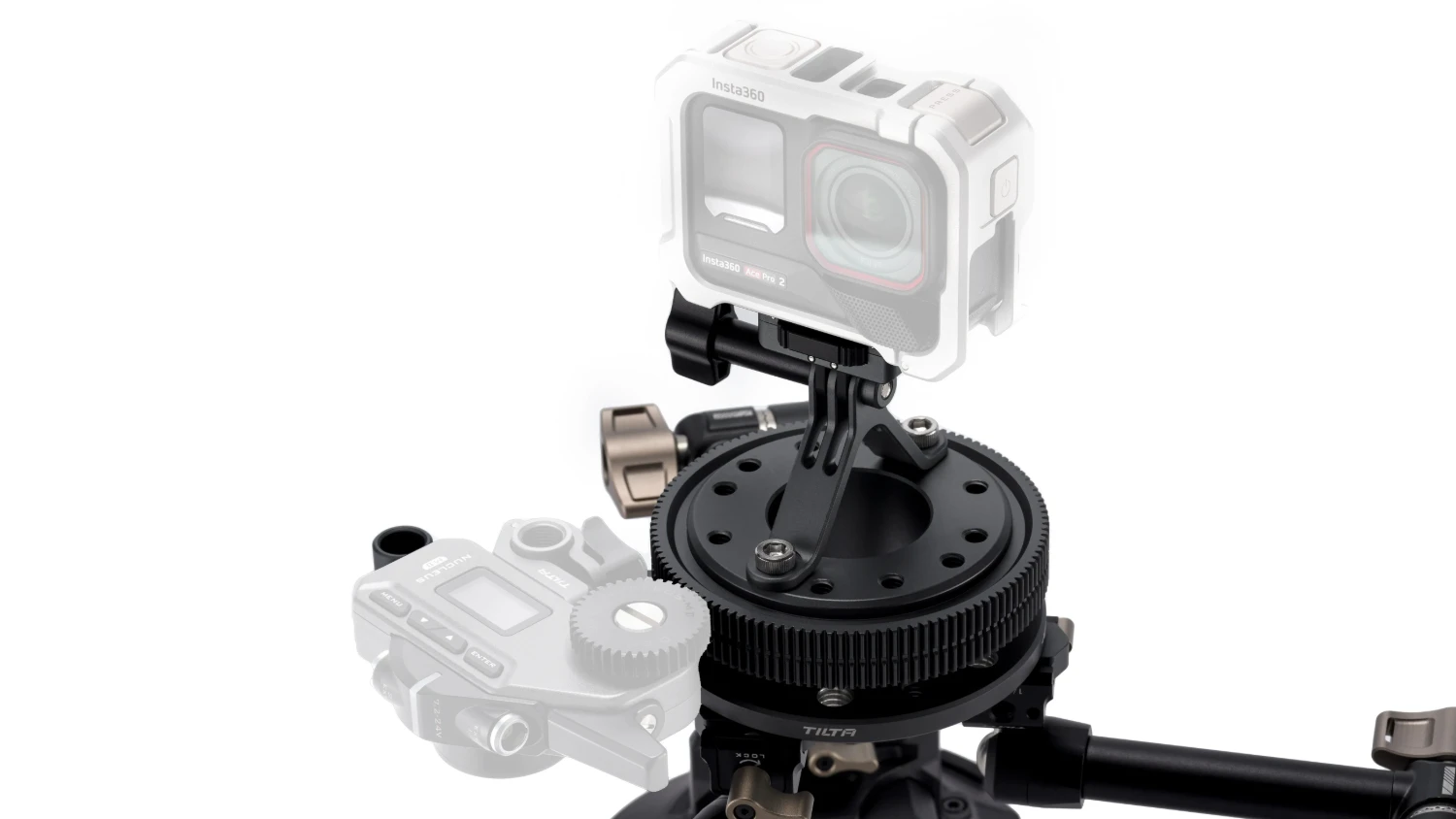 La base de este sistema es una plataforma giratoria con engranajes para accionar el motor de enfoque. Las cámaras de pequeño tamaño, como las cámaras de acción o las cámaras réflex digitales, se pueden fijar mediante una placa de montaje rápido.