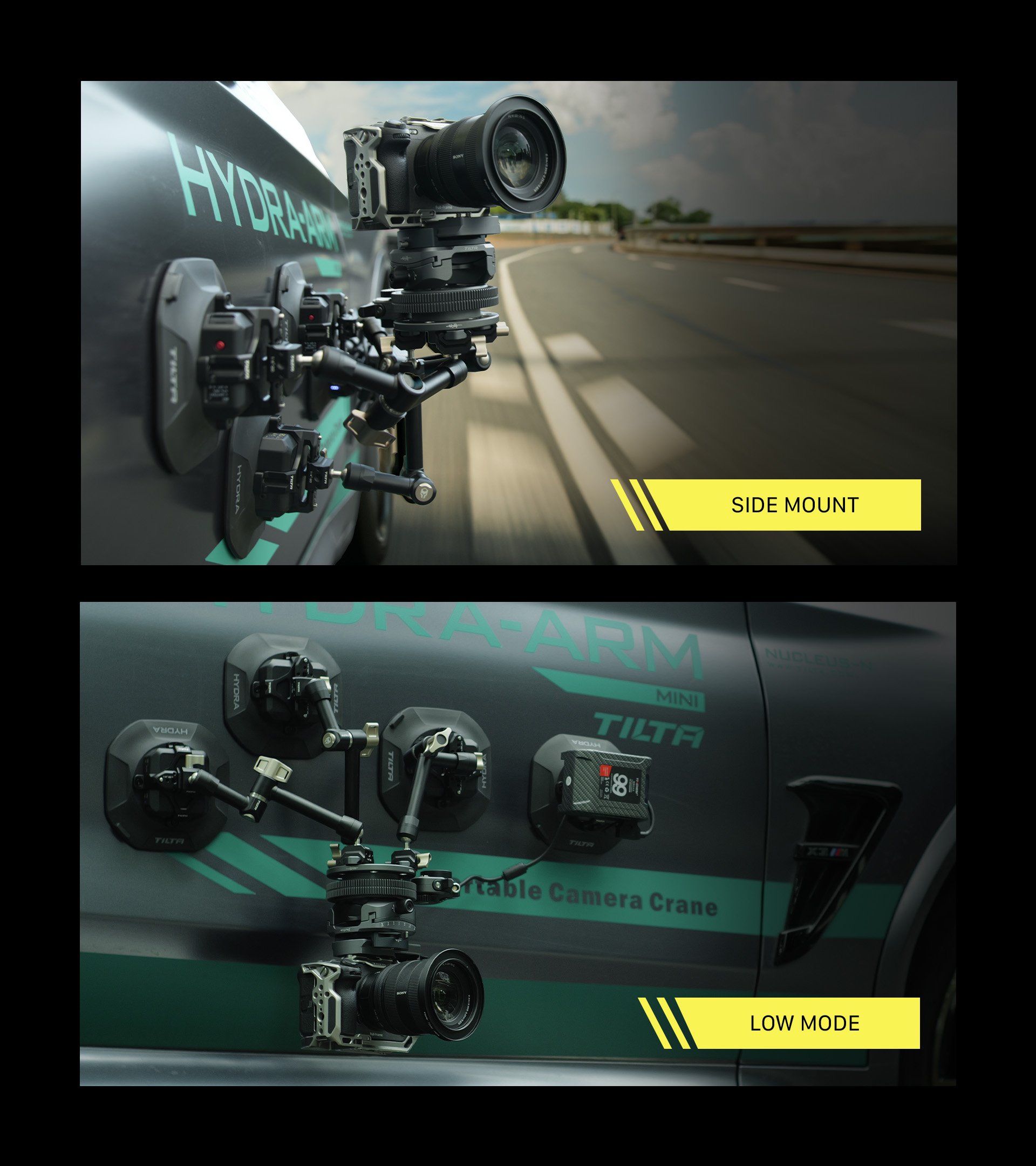 Este sistema está diseñado para ayudar a capturar la acción a alta velocidad típica de las tomas de coche a coche, pero también se puede utilizar en otros escenarios creativos de rodaje gracias a varios puntos de fijación en la propia unidad, como roscas NATO y de ¼”-20.