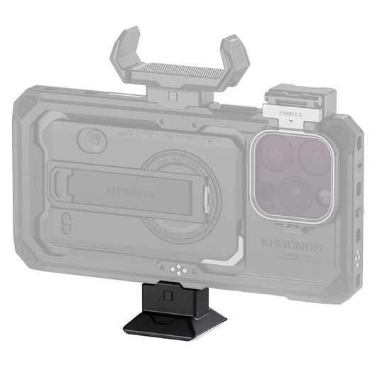 El Tilta TK-ARCA-38-B se acopla a cualquiera de los varios puntos de fijación rápida situados alrededor de la carcasa Khronos mediante la misma abrazadera de sujeción segura con botón rojo que el resto del sistema. Una vez acoplado, ofrece una unión ARCA-Swiss de 38 mm de precisión con bordes antideslizantes que encaja perfectamente en las abrazaderas de los gimbals de la serie DJI RS, las placas Manfrotto/Sachtler ARCA, el trípode Peak Design Travel Tripod y prácticamente todos los demás soportes compatibles con ARCA. Su construcción de aluminio CNC garantiza un peso reducido (~30 g) y una perfecta armonía cromática en color negro mate, lo que lo convierte en la forma más rápida de pasar del vlogging manual a la grabación estabilizada con un gimbal o un trípode, sin tener que retirar los objetivos, el SSD, el micrófono o las luces.