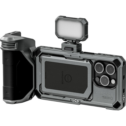 El kit básico Khronos para iPhone 15 Pro en color gris espacial con batería está diseñado especialmente para los entusiastas de la filmación con el móvil. Incluye una funda Khronos para iPhone 15 Pro que garantiza una sujeción segura y es compatible con el ecosistema de accesorios Khronos. El kit incluye el mango Khronos Focus PD Handle para una mayor estabilidad y control, junto con la luz Khronos Mini Daylight LED Light, que ofrece tres niveles de brillo y un alto CRI de 95 para una reproducción precisa del color. Gracias a la inclinación ajustable y al giro horizontal, los cineastas obtienen un control preciso sobre el encuadre y la composición. La batería integrada admite la carga a través de USB-C, lo que garantiza un uso prolongado sin interrupciones.