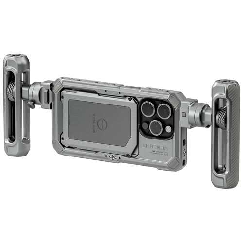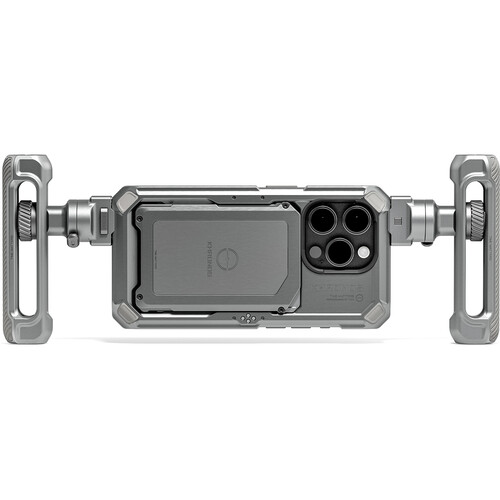 El kit ligero Tilta Khronos para iPhone 15 Pro, en color blanco titanio, está diseñado para la filmación móvil e incluye componentes básicos como la funda Khronos para iPhone 15 Pro y una empuñadura ajustable. Este kit se integra a la perfección en el ecosistema de accesorios Khronos y garantiza la seguridad de tu iPhone gracias a una carcasa resistente con 4 tornillos y abrazaderas de sujeción. Ofrece nueve puntos de montaje y contactos electrónicos para alimentar los accesorios, además de la posibilidad de ajustar la altura y girar 180°. Además, incluye roscas de 1/4"-20 en la parte superior e inferior para una fijación versátil de los accesorios y está equipado con un cómodo mango de silicona para un mejor manejo durante la grabación.
