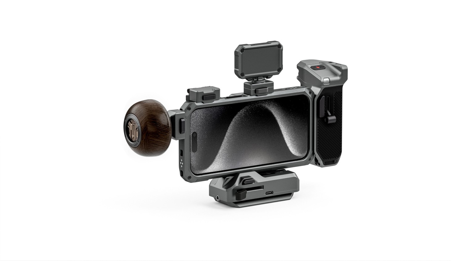 La empuñadura circular de madera sirve como opción de control alternativa y está equipada con un riel NATO integrado para fijar accesorios de cámara más tradicionales. La propia empuñadura de madera cuenta con una pequeña articulación giratoria que permite rotarla para colocarla en la configuración más cómoda para una toma o ajuste concreto.
