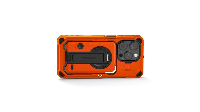 La funda Khronos cuenta con puntos de contacto electrónicos integrados en toda su superficie, lo que permite transmitir energía a través de la carcasa para alimentar los accesorios cuando se utiliza la empuñadura de alimentación opcional. Una novedad de la funda para el iPhone 16 es la barra táctil para controlar la cámara, que ofrece a los usuarios acceso completo a las funciones de la barra táctil del iPhone 16.