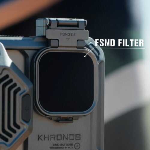 El soporte para filtros se acopla fácilmente a la carcasa Khronos mediante una conexión magnética segura y está equipado con un soporte giratorio que permite que el soporte encaje en su sitio sobre las tres lentes del iPhone 16 Pro/Pro Max.