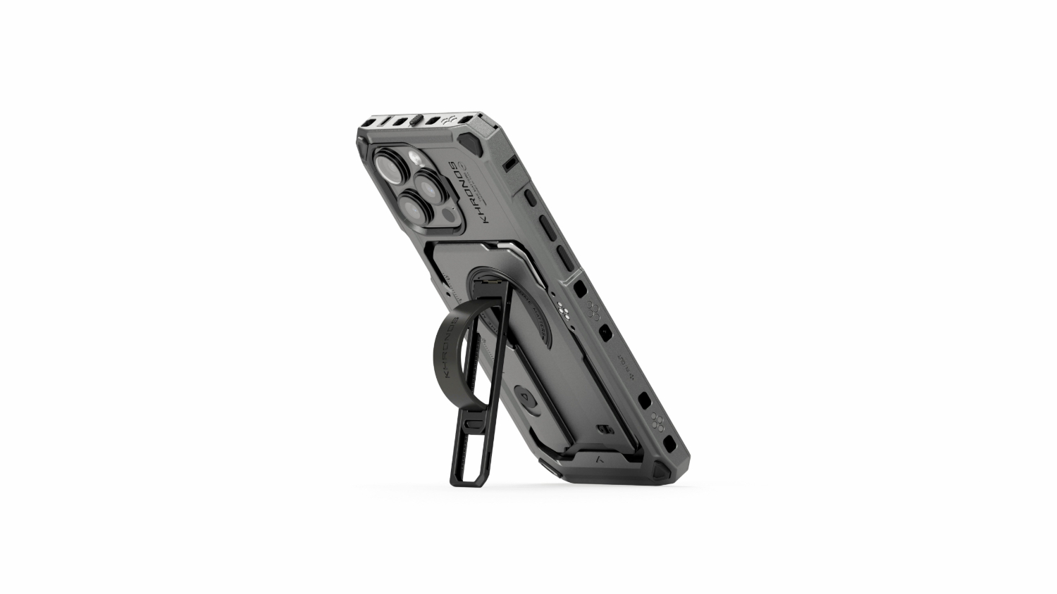 La funda Khronos cuenta con puntos de contacto electrónicos integrados en toda su superficie, lo que permite transmitir energía a través de la carcasa para alimentar los accesorios cuando se utiliza la empuñadura de alimentación opcional. Una novedad de la funda para el iPhone 16 es la barra táctil para controlar la cámara, que ofrece a los usuarios acceso completo a las funciones de la barra táctil del iPhone 16.