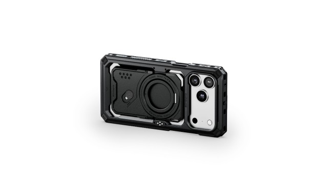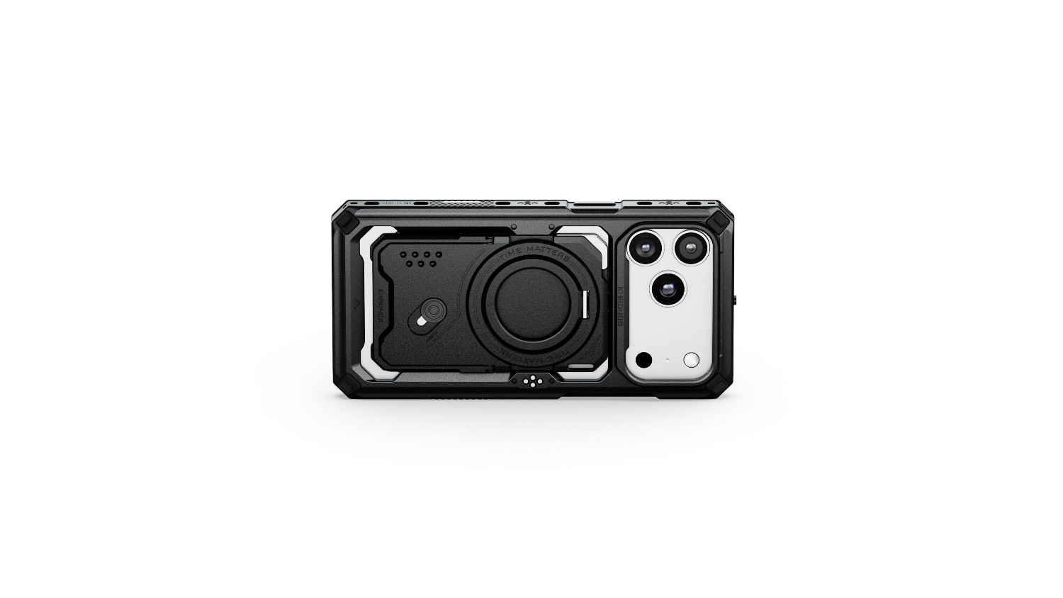 La funda Tilta Khronos para iPhone 17 Pro Max en color negro es una funda protectora para smartphone inspirada en el bastidor de cámara que constituye el núcleo del sistema de cine móvil Khronos. Está diseñada a medida para el iPhone 17 Pro Max y cuenta con un diseño de fijación rápida para una instalación y desmontaje ágiles. Su principal ventaja funcional es la ALIMENTACIÓN PASSTHROUGH a través de puntos de contacto electrónicos integrados para una alimentación continua de los accesorios. El robusto diseño LOCKING CLAMP sujeta el teléfono y ofrece más puntos de conexión para los accesorios EXPANDABLE DESIGN (asas, luces, módulos de refrigeración, etc.).