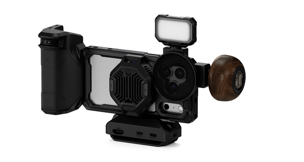 Control de temperatura: El sistema de refrigeración V2 para Khronos es un disipador de 22 W con frecuencia variable que se fija magnéticamente (compatible con MagSafe) y ayuda a reducir el sobrecalentamiento durante largas sesiones de grabación, al tiempo que carga el iPhone de forma inalámbrica.