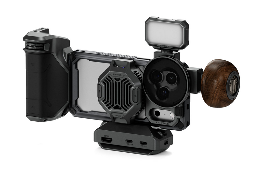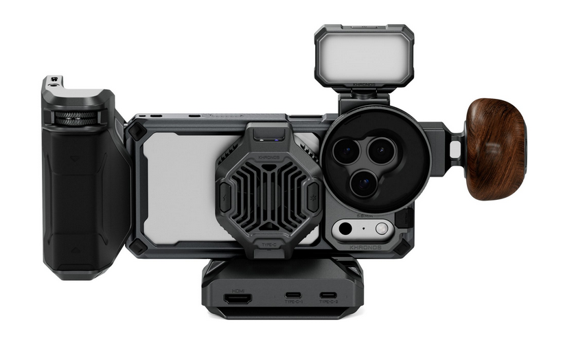 • Control de temperatura: El sistema de refrigeración V2 para Khronos es un disipador de 22 W con frecuencia variable que se fija magnéticamente (compatible con MagSafe) y ayuda a reducir el sobrecalentamiento durante largas sesiones de grabación, al tiempo que carga el iPhone de forma inalámbrica.