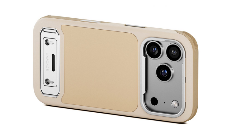 La funda Tilta Khronos Lite para el iPhone 17 Pro (color champán) ofrece un rendimiento profesional en un diseño más ligero. Incluye un soporte integrado vertical y horizontal para visualización, una placa trasera con imanes potentes para fijar rápidamente accesorios (soportes para tarjetas, SSD, luces) y un panel táctil capacitivo para un control preciso de la cámara.