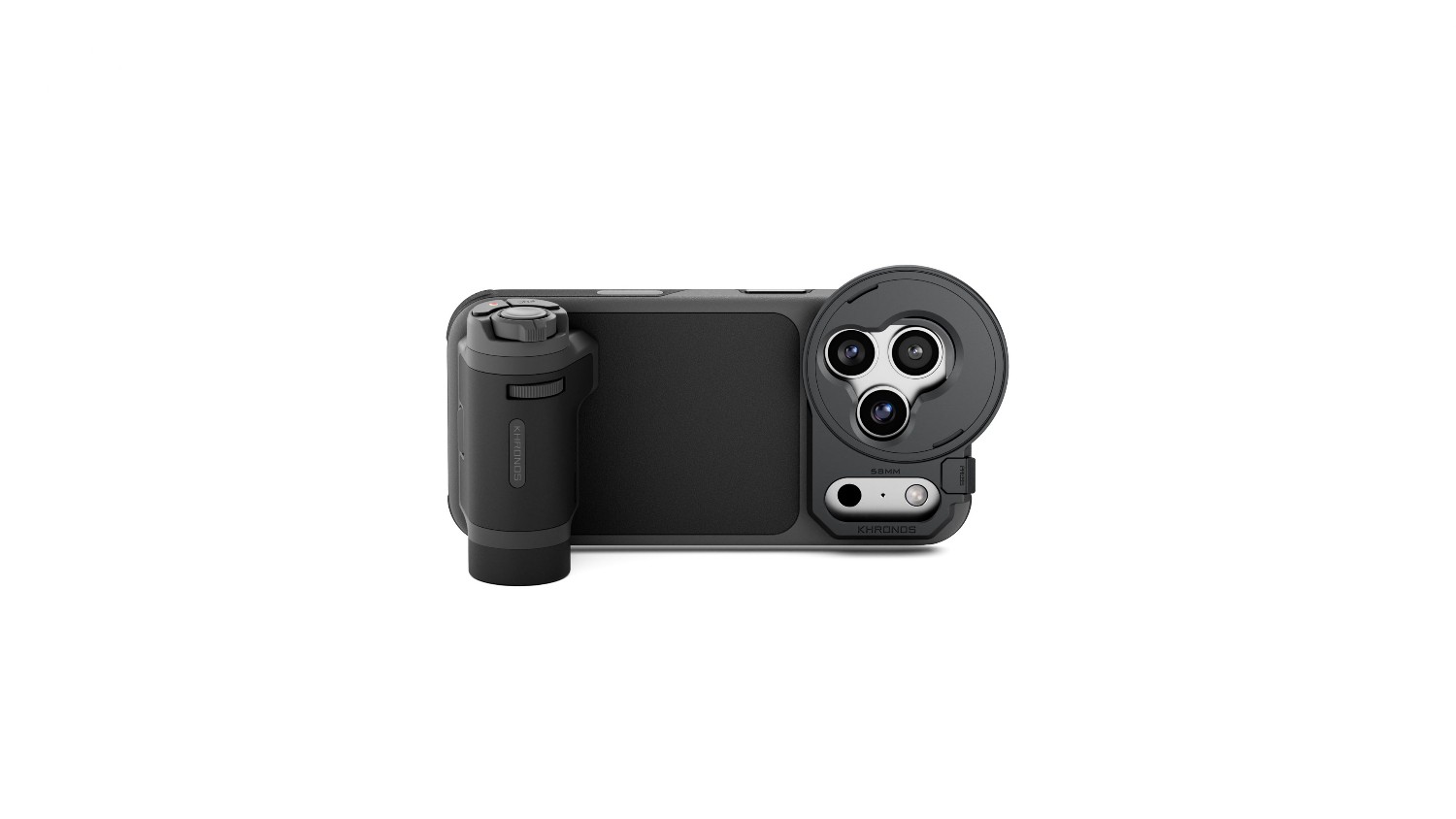 Mango ergonómico con Bluetooth: el ligero mango, incluido en el paquete, se acopla directamente a los puntos de montaje del soporte de la funda Khronos Lite. Se comunica a través de Bluetooth, por lo que el puerto USB-C de tu iPhone queda libre para la carga, un SSD externo o concentradores. Controla el enfoque, el zoom, el disparador y la grabación directamente desde el mango.