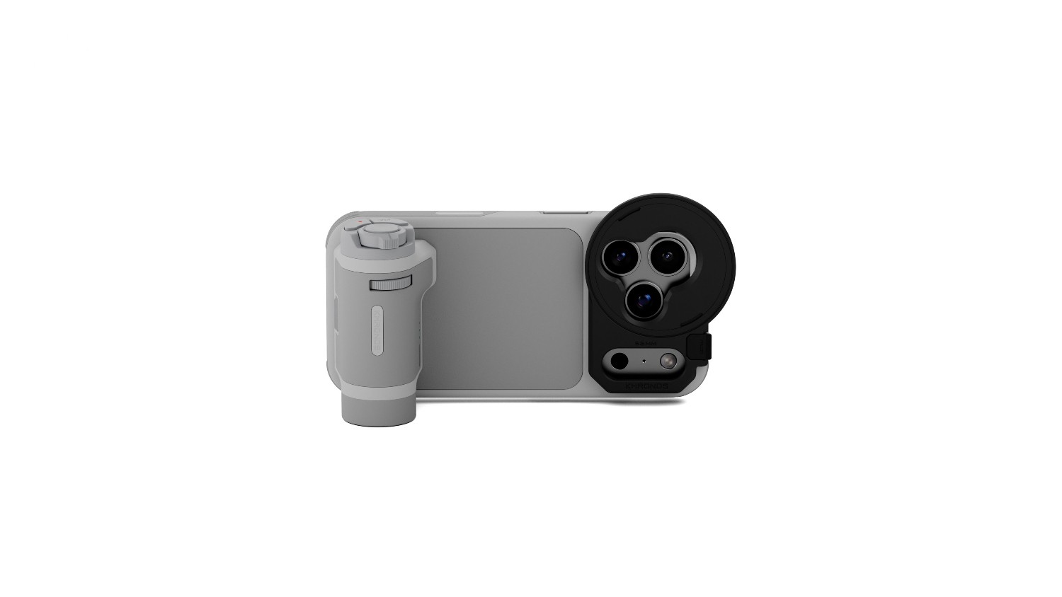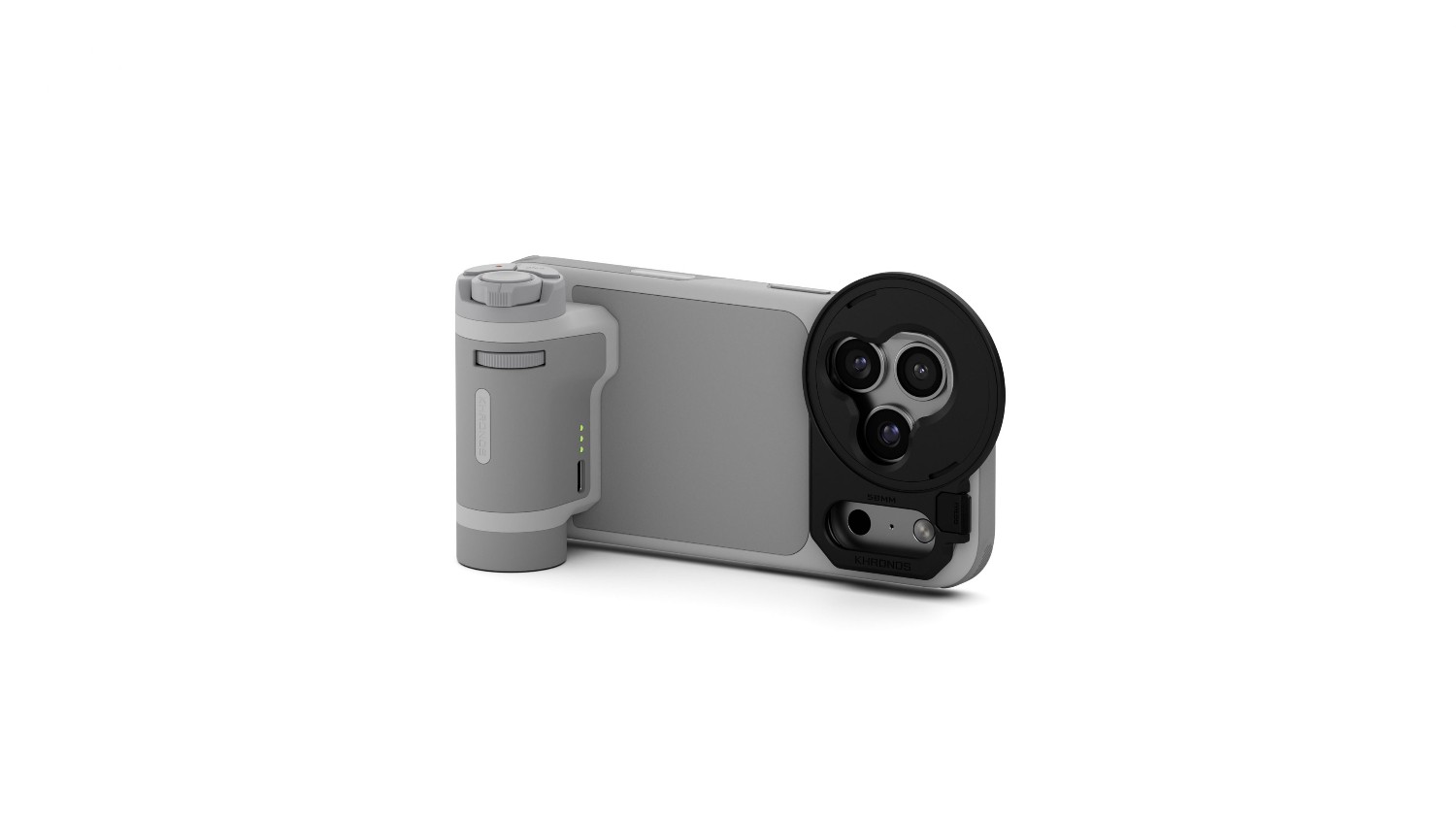 El kit portátil Tilta Khronos Lite, en color gris claro, es un diseño ligero especialmente concebido para el iPhone 17 Pro que ofrece un rendimiento profesional en un formato compacto. Cuenta con un mango ergonómico con control de enfoque y zoom vía Bluetooth, una placa trasera magnética para accesorios y es compatible con filtros de 58 mm de diámetro.