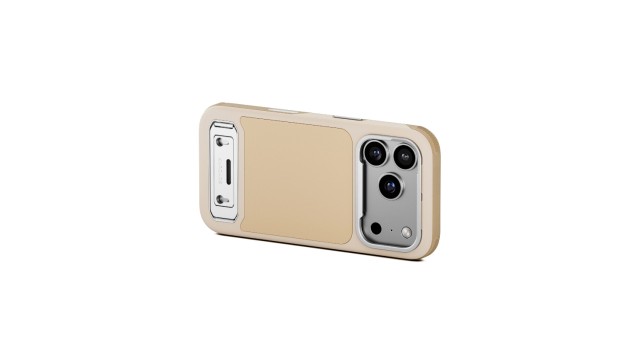 La funda Tilta Khronos Lite Case en color Champagne es una funda protectora profesional y ligera para el iPhone 17 Pro Max. Cuenta con un soporte integrado para ver el dispositivo sin necesidad de usar las manos, una placa trasera magnética para fijar accesorios y una protección reforzada para la cámara y las esquinas.
