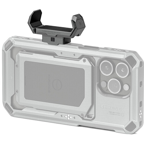 El soporte universal para SSD Tilta Khronos, en color gris espacial, permite conectar cómodamente un disco SSD externo u otros accesorios a la funda Khronos para iPhone, compatible con el iPhone 15 Pro o Pro Max. Admite dispositivos con un ancho de entre 1,96 y 2,75 pulgadas y una altura de hasta 0,59 pulgadas.