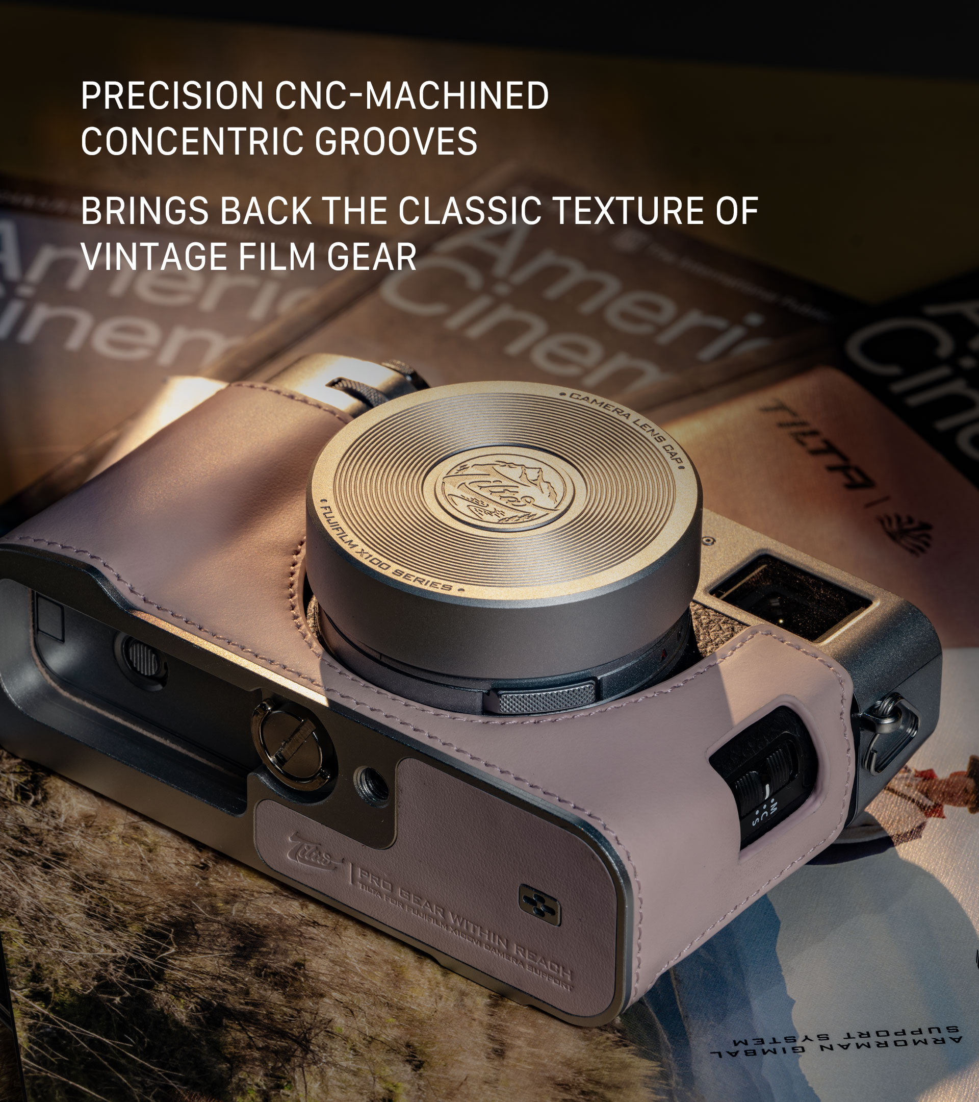 Fabricada mediante mecanizado CNC de precisión, esta tapa de objetivo presenta unas ranuras concéntricas finamente elaboradas que ofrecen un tacto texturizado y evocan la elegancia clásica de las cámaras de cine históricas.