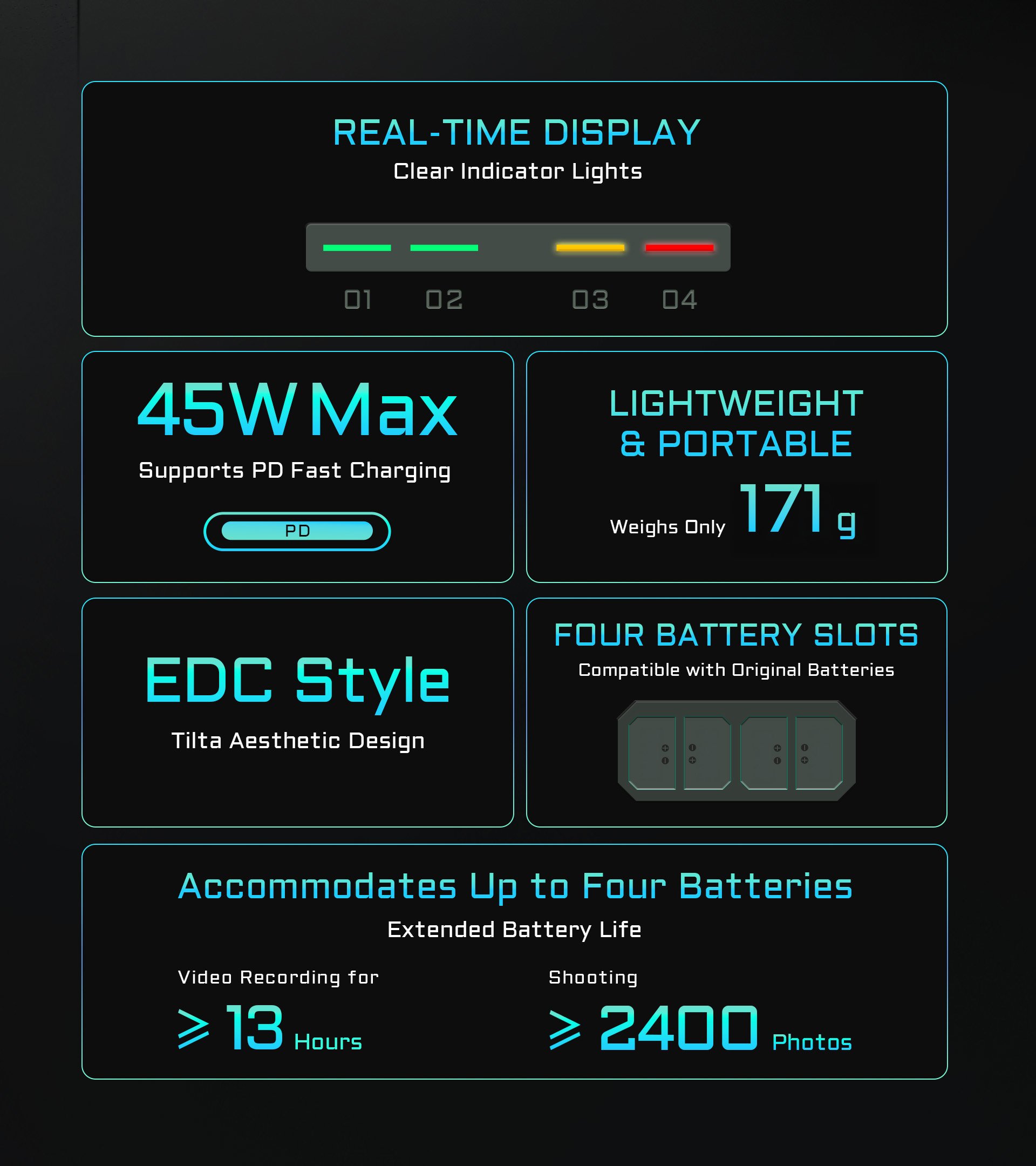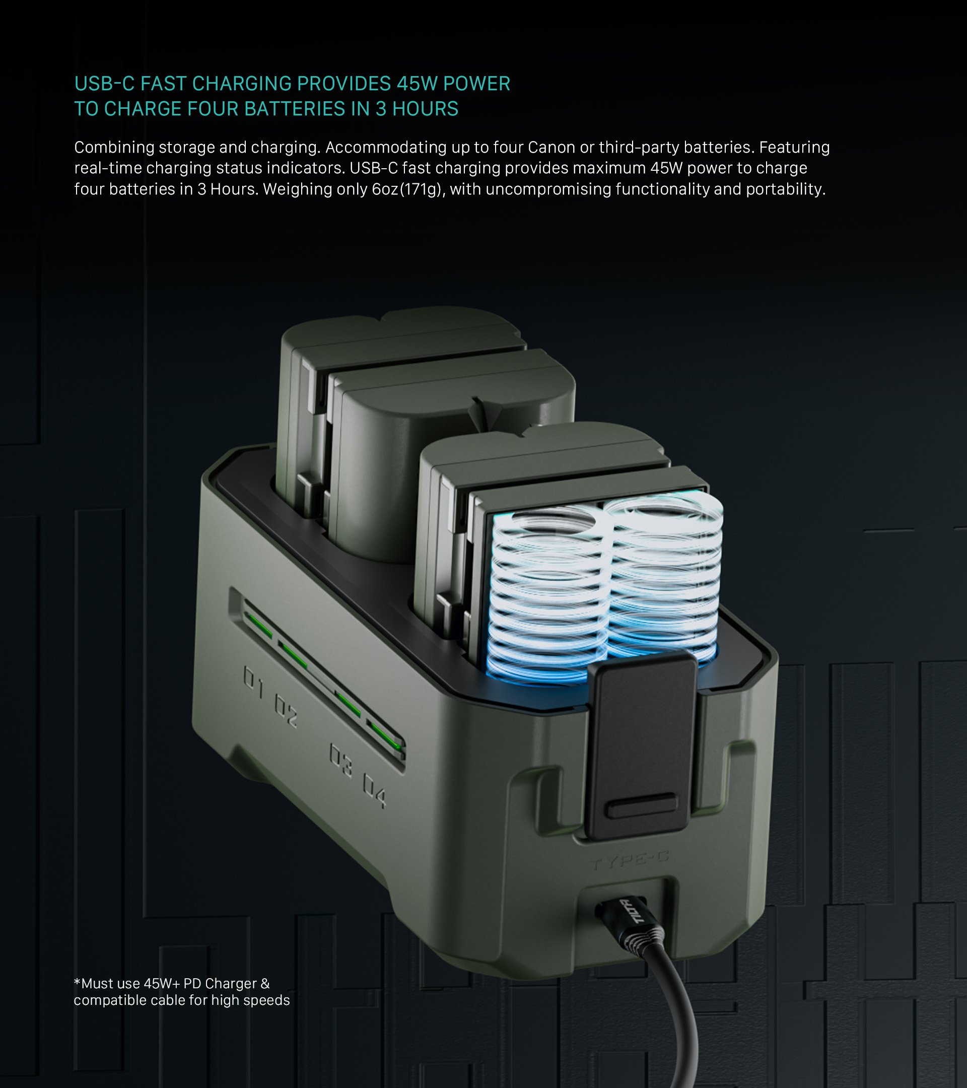 Esta estación de carga compacta está diseñada para baterías LP-E6 de Canon y de otros fabricantes, y cuenta con cuatro ranuras que facilitan la carga y permiten un almacenamiento cómodo. Está equipada con carga rápida PD de 45 W y ofrece una velocidad de carga un 68 % superior a la de un cargador estándar básico, por lo que tus baterías estarán listas para la acción en tan solo 3 horas.
