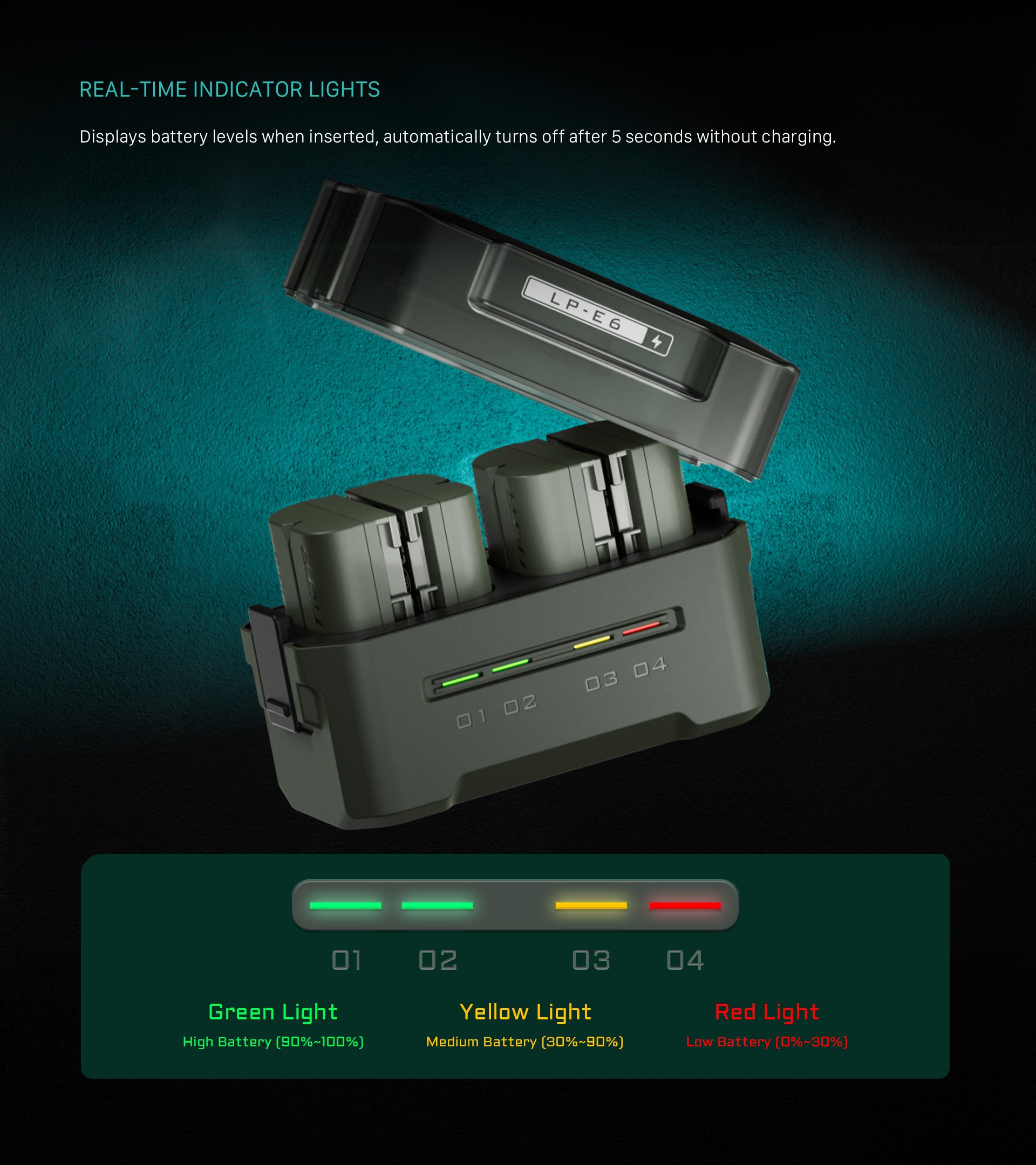 Esta compacta estación de carga está diseñada para admitir baterías LP-E6 de Canon y de otros fabricantes, y ofrece cuatro ranuras para una carga sencilla y un almacenamiento cómodo.
