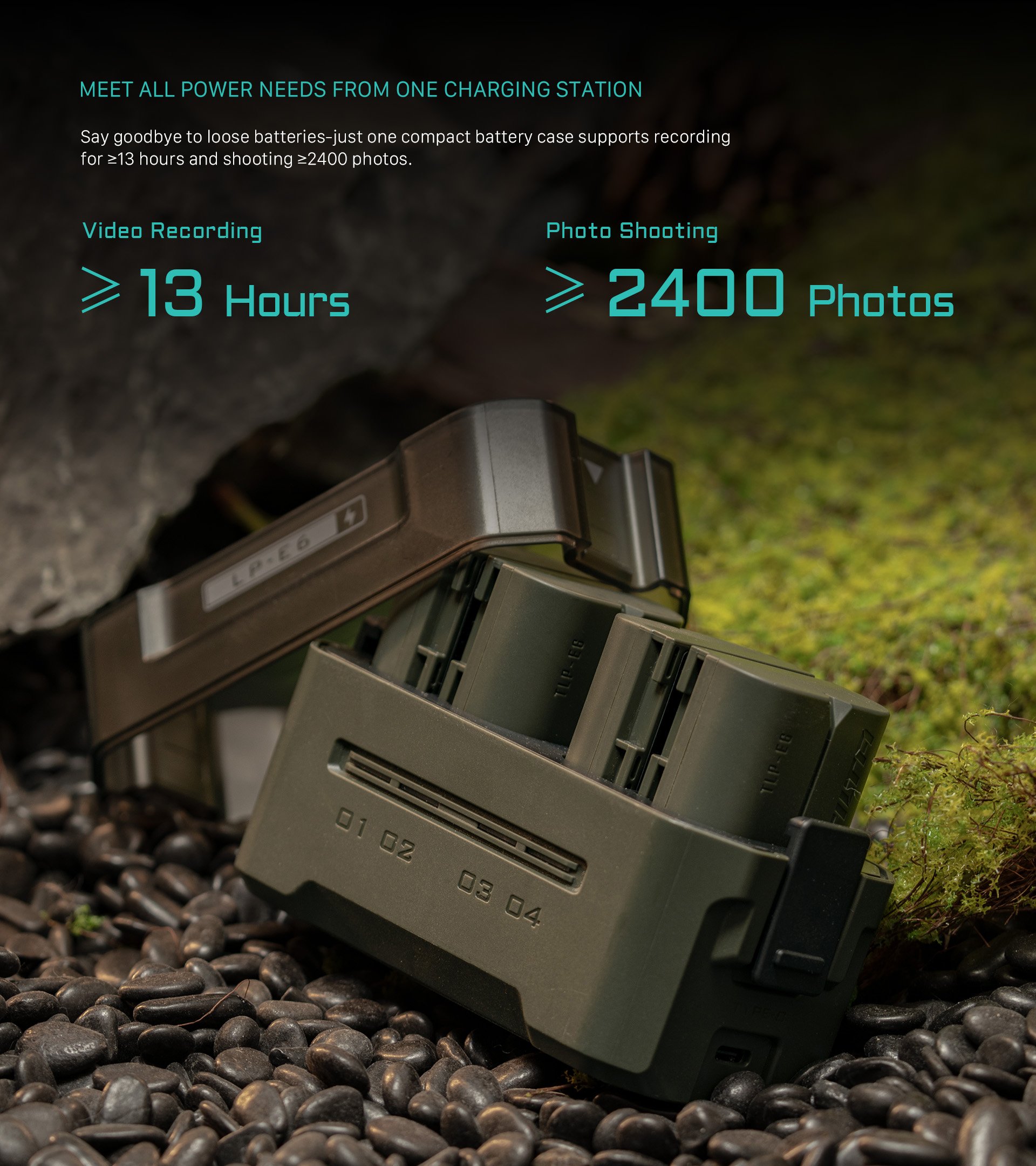 Gracias a la posibilidad de cargar completamente cuatro baterías LP-E6, los usuarios estarán preparados para hasta 13 horas de grabación de vídeo o tendrán energía suficiente para procesar 2400 fotografías, lo que resulta ideal para sesiones fotográficas prolongadas.