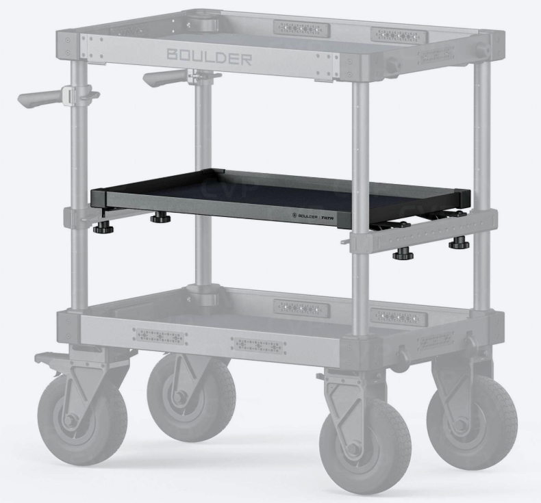 La bandeja central Tilta TC-MLT-B, fabricada en aluminio anodizado negro y con un diseño inteligente, amplía la capacidad de almacenamiento de la gama de carros Tilta Boulder Camera Cart (pequeño, mediano y grande) sin limitar su movilidad. La instalación se realiza en solo unos segundos mediante abrazaderas de resorte sin necesidad de herramientas en los rieles horizontales inferiores del carro, creando así un estante firme que abarca todo el ancho, situado aproximadamente en el centro entre la bandeja superior y el suelo, ideal para objetos de uso frecuente, como baterías de repuesto, tarjetas de memoria, tapas de objetivos, receptores inalámbricos o un pequeño monitor de campo.