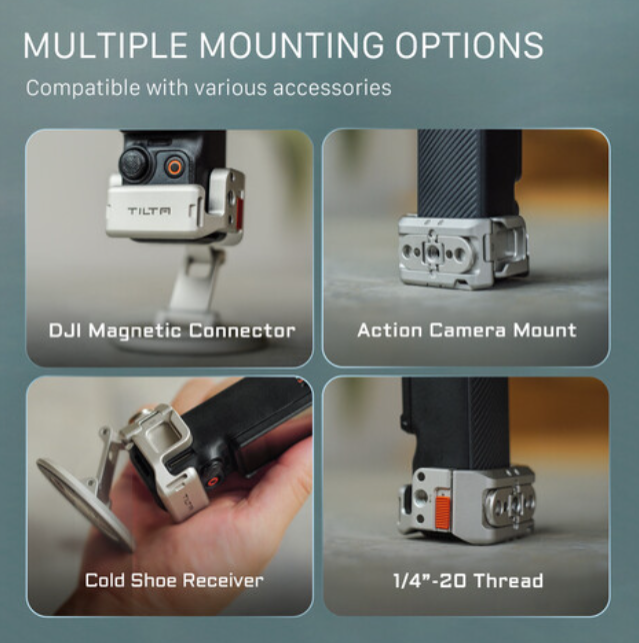 El Tilta TA-T65-MAE-TW Mini Accessory Mounting Expander (Titanium White) es un soporte de aluminio ultraligero y de perfil bajo que se fija magnéticamente al DJI Osmo Pocket 3 y añade al instante un flash externo, una rosca de 1/4"-20, un soporte de 3 puntos y otro punto magnético, al tiempo que protege la cámara con un acolchado de silicona suave…