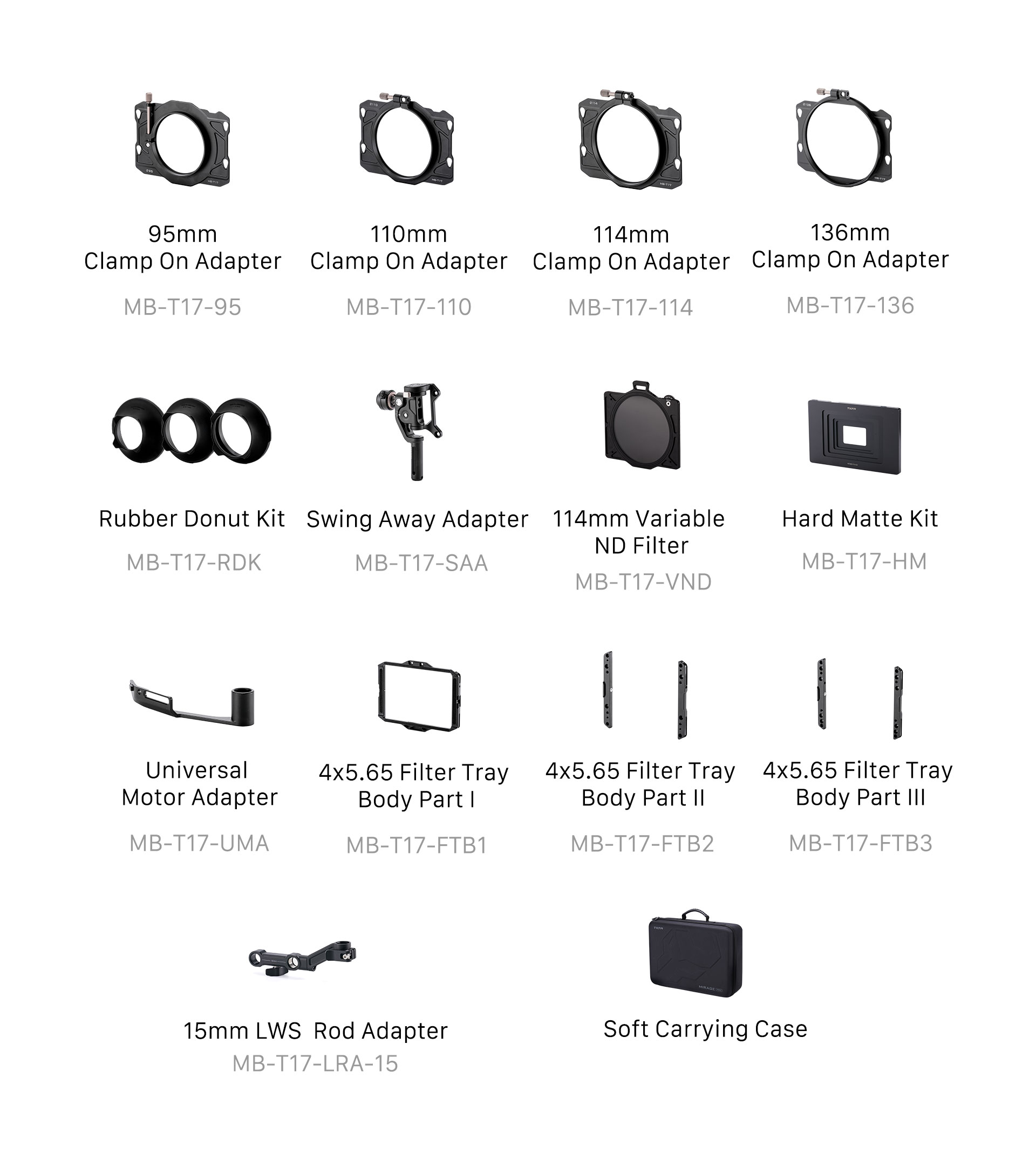 1: Adaptadores de pinza para la caja mate Tilta Mirage Pro (95 mm, 110 mm, 114 mm, 136 mm) *1 juego