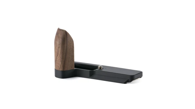 Presentamos una base de montaje con empuñadura de madera para la cámara Canon PowerShot V1. La característica principal de este accesorio, con forma de soporte en L, es su empuñadura de madera de nogal. Esta garantiza un manejo y una manipulación más cómodos de la cámara, sin dejar de ser compacta y adecuada para viajar.