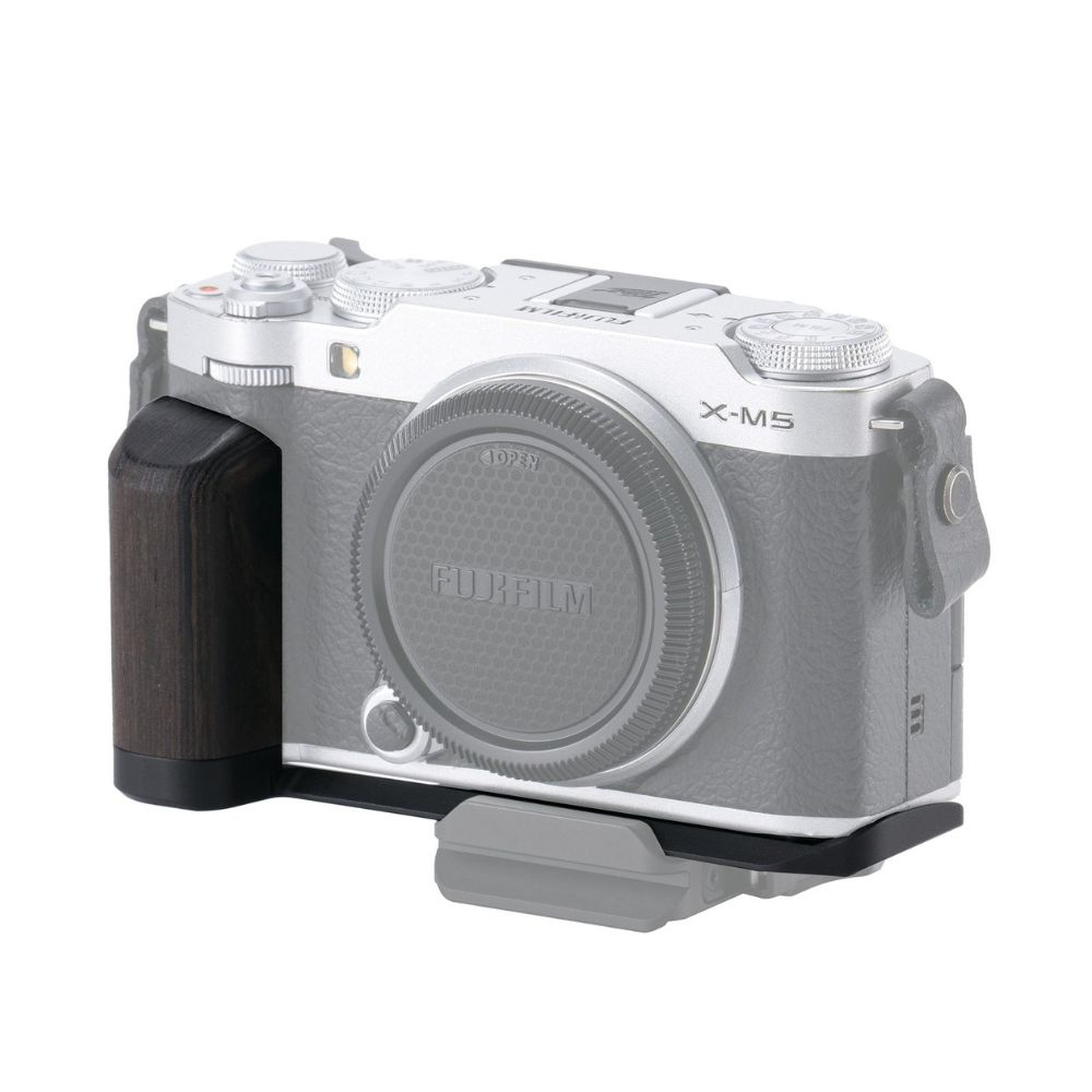 Este accesorio en forma de soporte en L cuenta con un agarre de madera de nogal que garantiza un manejo y una sujeción más cómodos de la cámara Fujifilm X-M5.