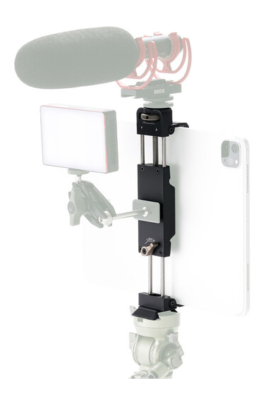 El TA-MMC-AI-B es una pinza tipo «navaja suiza» con un diseño excelente, pensada para creadores que utilizan un iPad, un iPad mini o teléfonos de gran tamaño como monitores en el plató. Los brazos abatibles con almohadillas de goma sujetan dispositivos desde el iPhone hasta el iPad Pro de 12,9″ sin rayarlos, mientras que la parte inferior está equipada con una placa giratoria Arca-Swiss (cambio instantáneo entre los modos vertical y horizontal) y toda la parte trasera está formada por una guía NATO a lo largo de toda su longitud, que también funciona como una segunda placa Arca. La zapata superior y otras roscas de 1/4"-20 permiten acoplar luces, micrófonos o brazos mágicos. La palanca inferior permite un ajuste rápido y aproximado, mientras que el botón estriado superior permite un ajuste final preciso, y todo se puede plegar completamente para viajar.