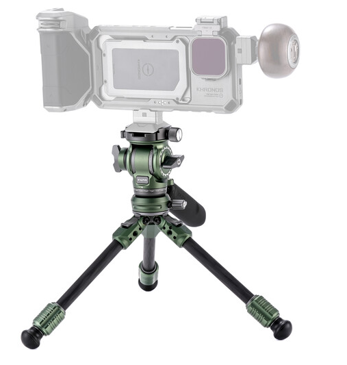 El cabezal de vídeo de mesa Tilta VT03, con patas de trípode de fibra de carbono de un solo tramo en color verde bosque, es un trípode de mesa compacto y portátil diseñado para creadores de contenido y cineastas. Está equipado con un cabezal fluido Arca de 360°, patas ajustables de fibra de carbono con bloqueo giratorio y un mango telescópico que soporta hasta 3 kg y ofrece un posicionamiento preciso y opciones universales de fijación de cámaras y accesorios.