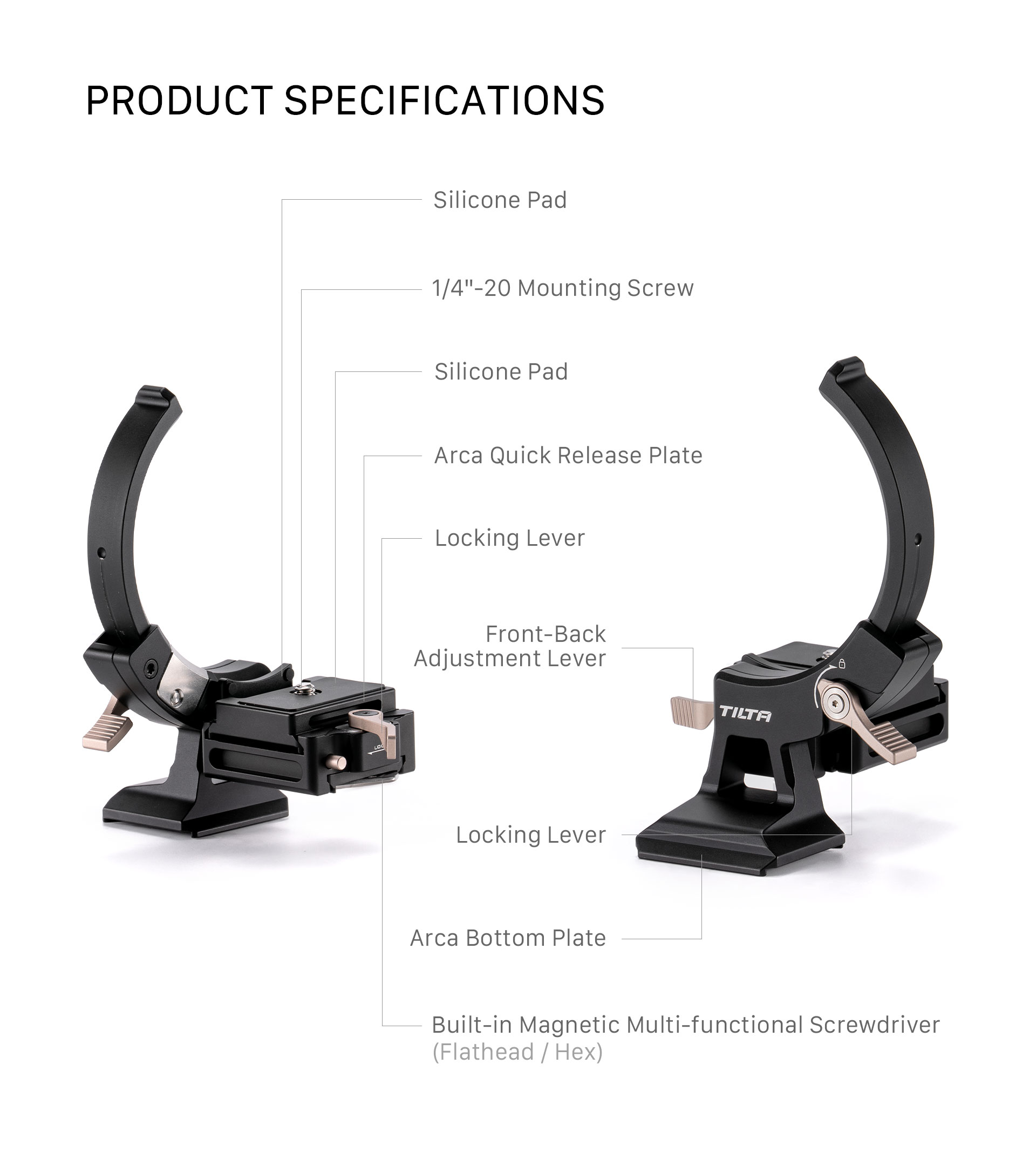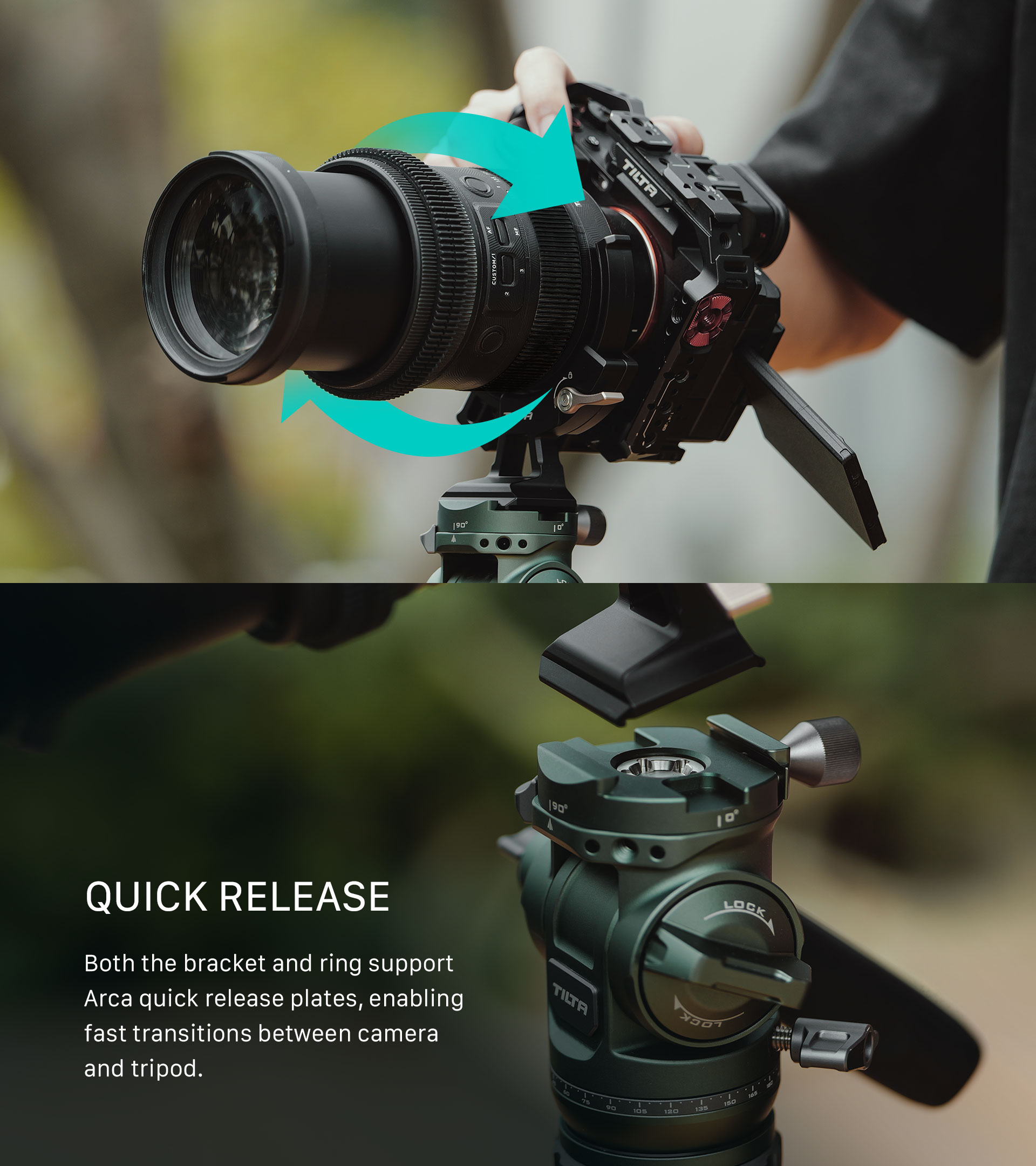 Este accesorio ligero, basado en la tecnología Arca, permite a los usuarios cambiar instantáneamente entre la configuración de disparo horizontal y vertical.