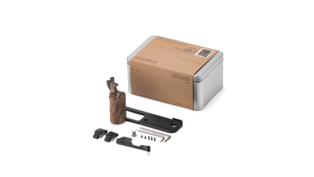 La base de este kit es un soporte en L con un mango de madera de nogal que proporciona una forma más cómoda de controlar y manejar la cámara.