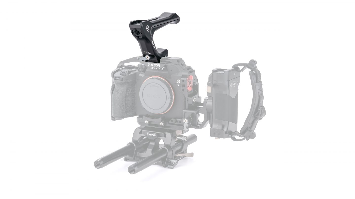 Esta empuñadura superior compacta tipo NATO se acopla de forma fácil y segura a la parte superior del cuerpo de la cámara Sony a7 IV.