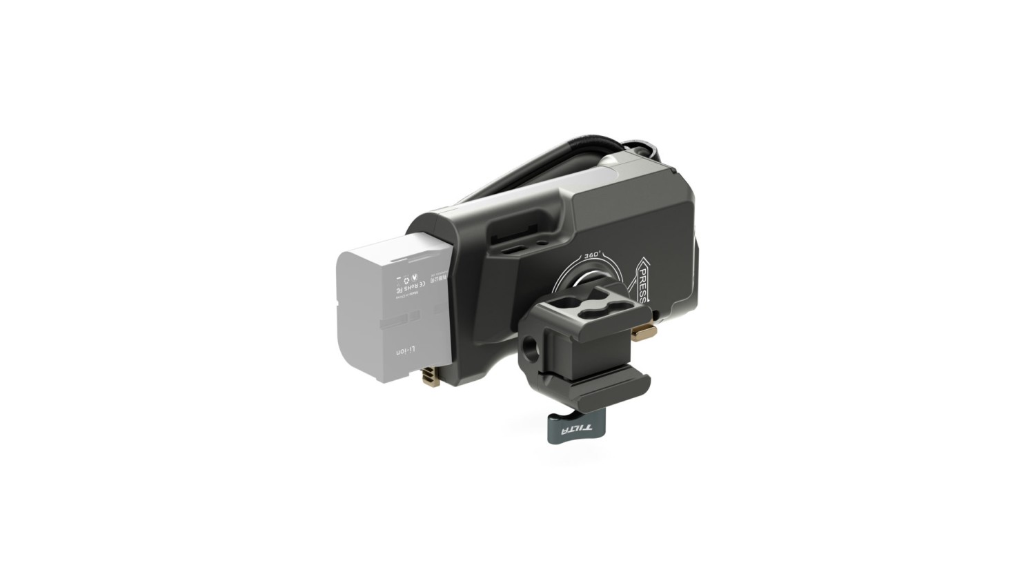 Esta empuñadura avanzada se fija en el lado izquierdo de la jaula de la cámara Tiltaing. El puerto para la batería situado en la parte inferior de la empuñadura permite utilizar una batería Sony F570 para alimentar diversos accesorios a través de las salidas USB-C de 8 V y CC de 12 V.