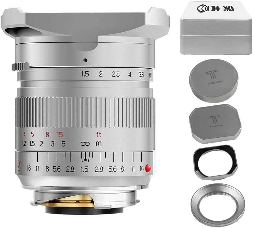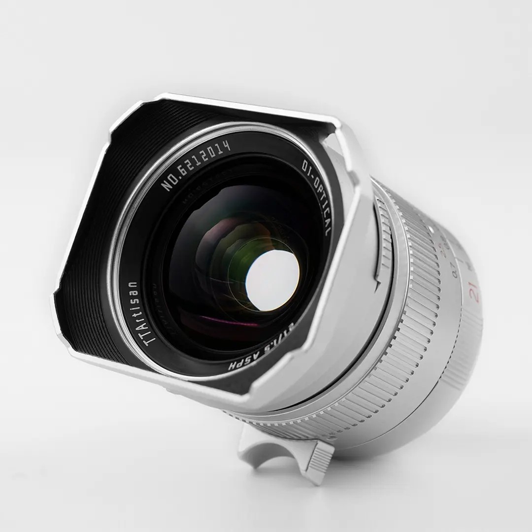 El objetivo TTArtisan 21 mm F1,5 es uno de los objetivos gran angulares más pequeños y ligeros para cámaras de formato completo. Su cuerpo totalmente metálico cuenta con 13 elementos en 11 grupos y 10 láminas de diafragma, y pesa entre 422 y 458 g. El paquete incluye un parasol tipo tulipán y un portafiltros redondo (tamaño del filtro: 72 mm), que ayudan a bloquear la luz difusa que causa reflejos y también proporcionan protección física a la parte delantera del objetivo.