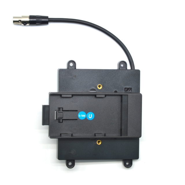 Alimente el monitor F-7H con la batería Sony BP-U30/U60 conectando este soporte para batería de TVLogic. El soporte para Sony BP-U30/U60 se fija a la parte trasera del monitor F-7H y se conecta al puerto de alimentación XLR mini de cuatro pines del monitor. Proporciona una alimentación de 12 V CC, 3 A.