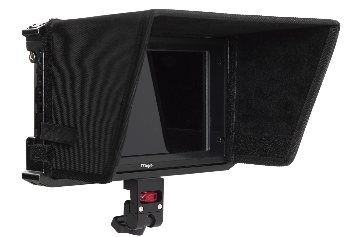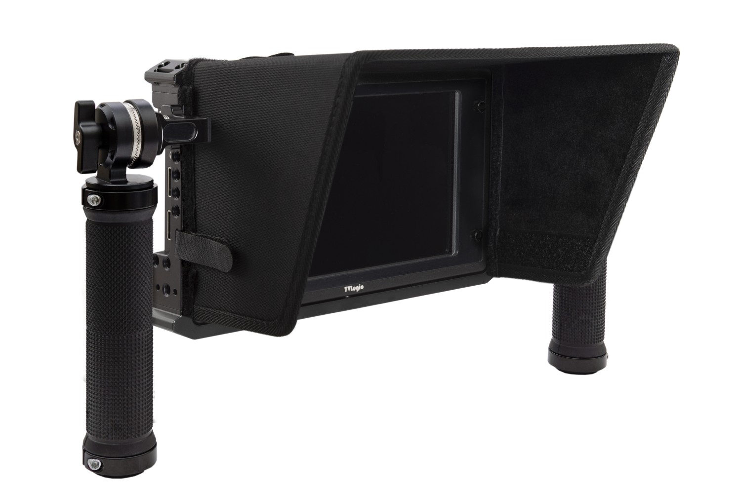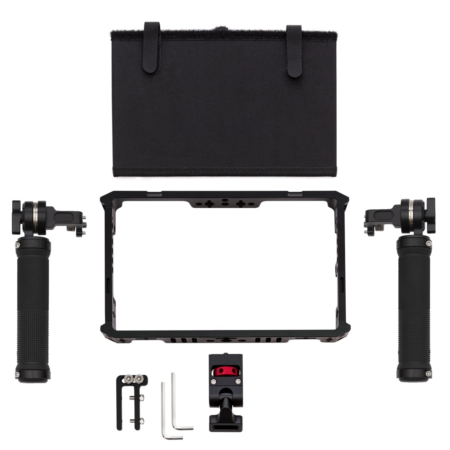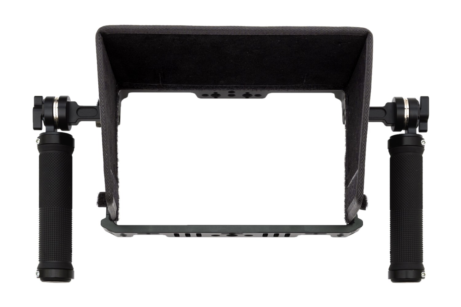 Jaula de aluminio para monitores de 7" TVLogic F-7H/M2/F-7HS, que incluye un par de asas (roseta ARRI) y un parasol. La jaula cuenta además con varias roscas de 1/4"-20 y 3/8"-16 para otros accesorios, pasacables para instalar una correa y un soporte para el cable HDMI..