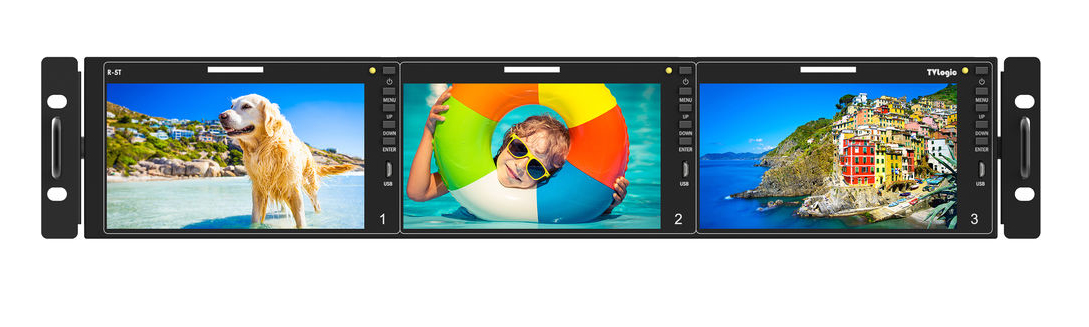 Tres monitores LCD Full HD de 5,5" con resolución 1920 x 1080 en una configuración de montaje en rack de 2U