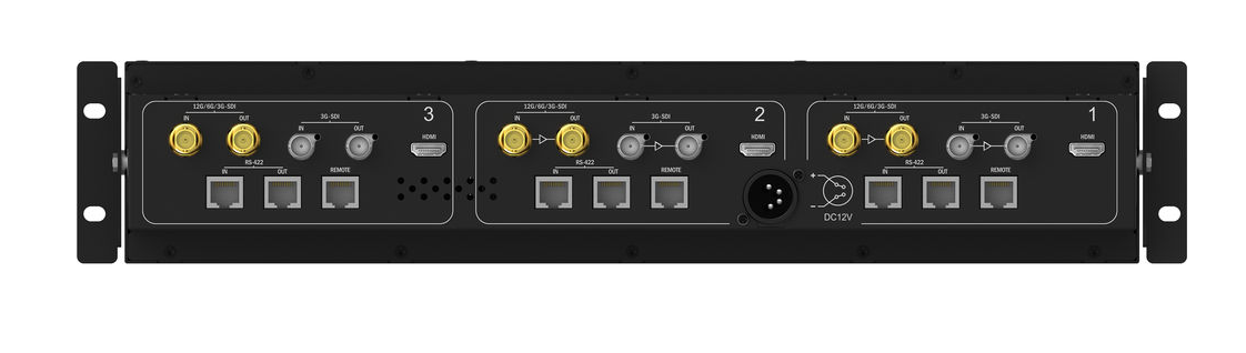E/S de vídeo: 3 entradas BNC 12G-SDI, 3 entradas BNC 3G-SDI, 3 entradas HDMI; 3 salidas BNC 12G-SDI, 3 salidas BNC 3G-SDI