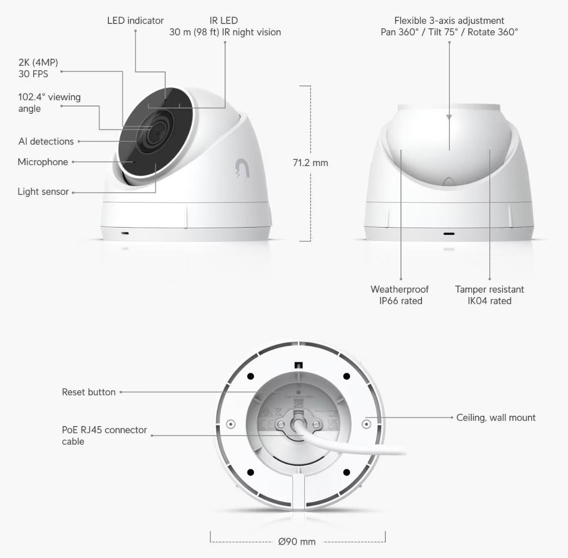 La UVC-G5-Turret-Ultra es una cámara de quinta generación de la serie UniFi Video. Cuenta con un sensor CMOS de 1/2,4" con una resolución de 4 MP (2688 x 1512 píxeles, 16:9) a 30 FPS. El objetivo fijo tiene un ángulo de visión de 102,4° en horizontal, 54,9° en vertical y 120,6° en diagonal. La cámara está equipada con un micrófono (que se puede desactivar) y un puerto Ethernet de 10/100 Mbps, a través del cual se alimenta la cámara mediante POE 802.3af o POE pasivo con una tensión de entrada de 37-57 V CC. Para el modo nocturno, la cámara cuenta con iluminación IR con un alcance de 30 m. ¡El consumo máximo es de tan solo 4 W!