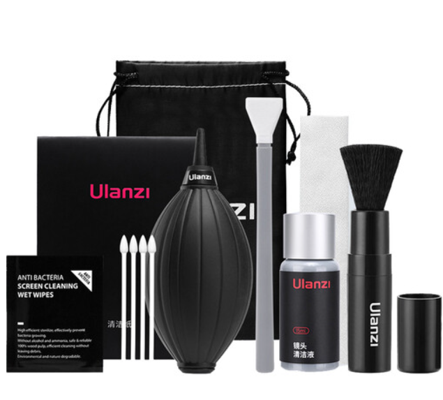 El kit de limpieza Ulanzi Ulanzi3173 9 en 1 es un estuche negro de 98 g que elimina el polvo de los sensores, objetivos, pantallas LCD y lentes de GoPro mediante un líquido antiestático, una espátula de microfibra, un paño de seda, 4 almohadillas, un soplador, un cepillo y 2 toallitas húmedas. Sin marcas, sin pelusas: tu dispositivo Canon/Fuji/Sony/Insta360 quedará limpio en solo 60 segundos.