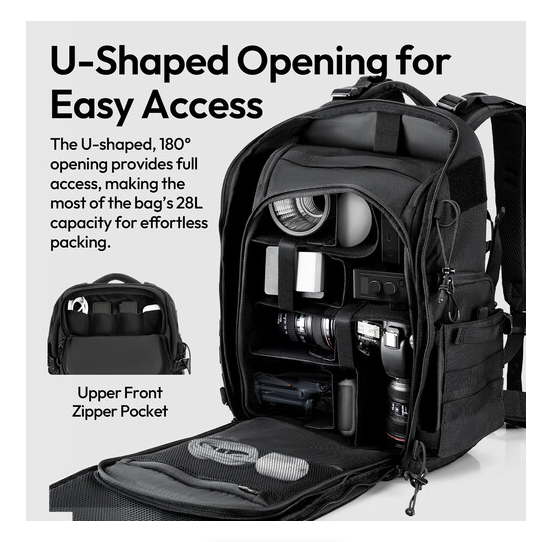 La mochila táctica ofrece un amplio espacio de almacenamiento, incluyendo un bolsillo superior de acceso rápido y fundas para un portátil de 15,7" y una tableta de 11". El compartimento principal se abre mediante una solapa para facilitar el acceso a la cámara, mientras que el panel lateral de acceso rápido te permite llevar la cámara contigo incluso cuando estás en movimiento. Las correas MOLLE frontales y laterales permiten fijar equipo adicional, y en el bolsillo lateral se puede guardar una botella de agua o un trípode de viaje. La mochila también incluye correas exteriores para sujetar objetos voluminosos, como chaquetas o sacos de dormir. Tanto si te dispones a hacer una sesión fotográfica como a vivir una aventura, esta mochila de 28 litros está diseñada para ofrecer comodidad, organización y protección a tu equipo.