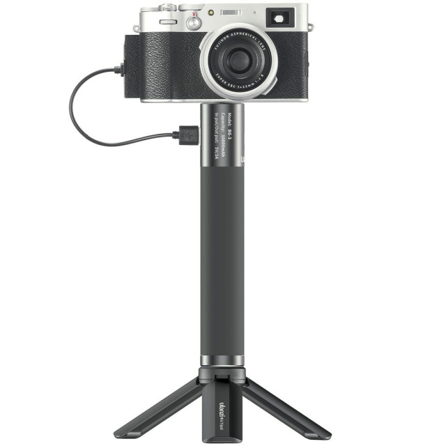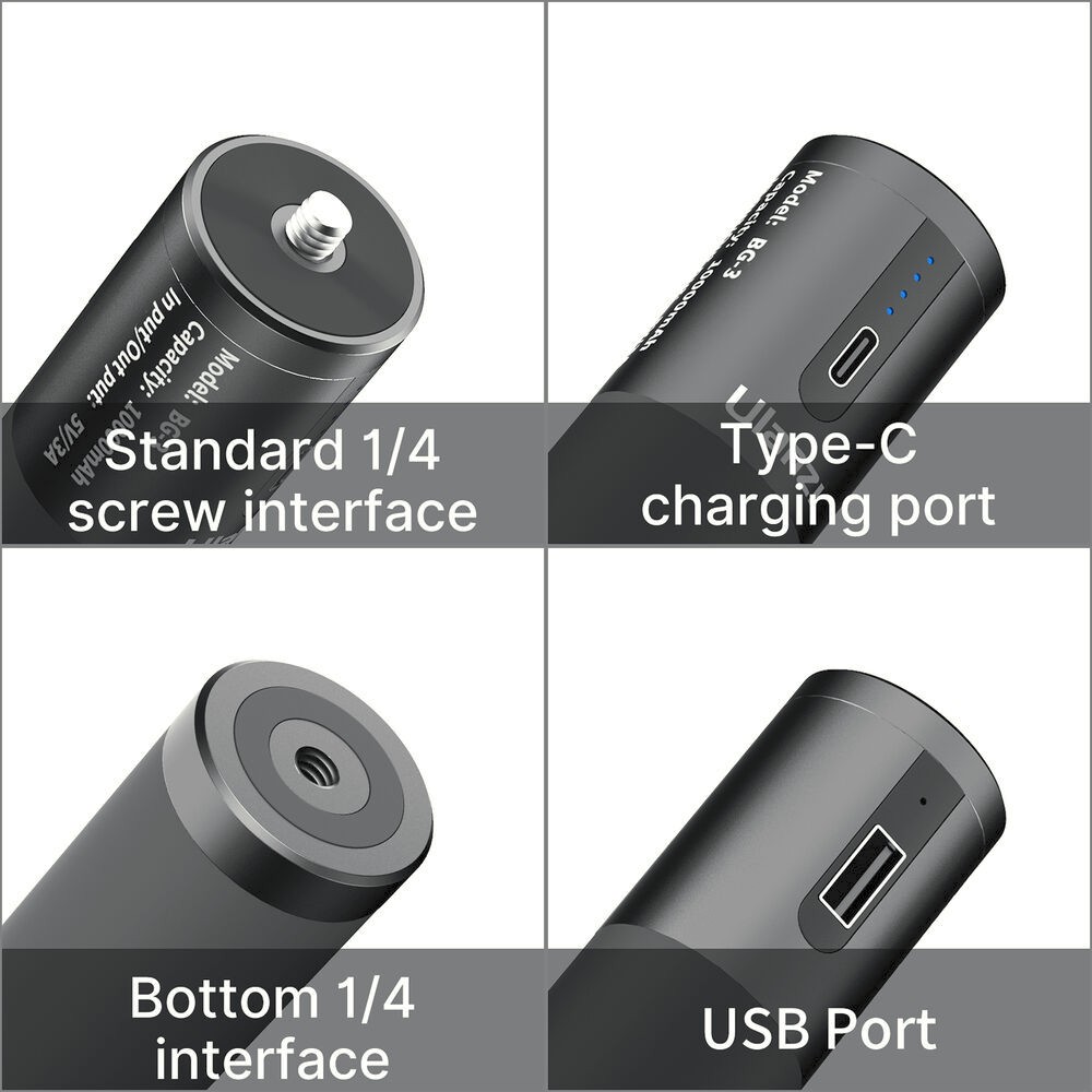 En la parte superior del BG-3 hay un tornillo de montaje de 1/4"-20 que permite acoplar cámaras de acción, cámaras compactas sin espejo, soportes para teléfonos, luces LED, micrófonos y otros accesorios. Para la fotografía estática, se puede acoplar un minitrípode a la rosca de 1/4"-20 de la parte inferior, lo que convierte el mango en un trípode estable para fotografía time-lapse, vlogs o fotos de mesa. Los indicadores LED muestran el estado de la batería y la carga, mientras que los dos puertos USB permiten cargar y utilizar el dispositivo al mismo tiempo. Ligero, versátil y compacto, el BG-3 es imprescindible para los creadores de contenido móvil.